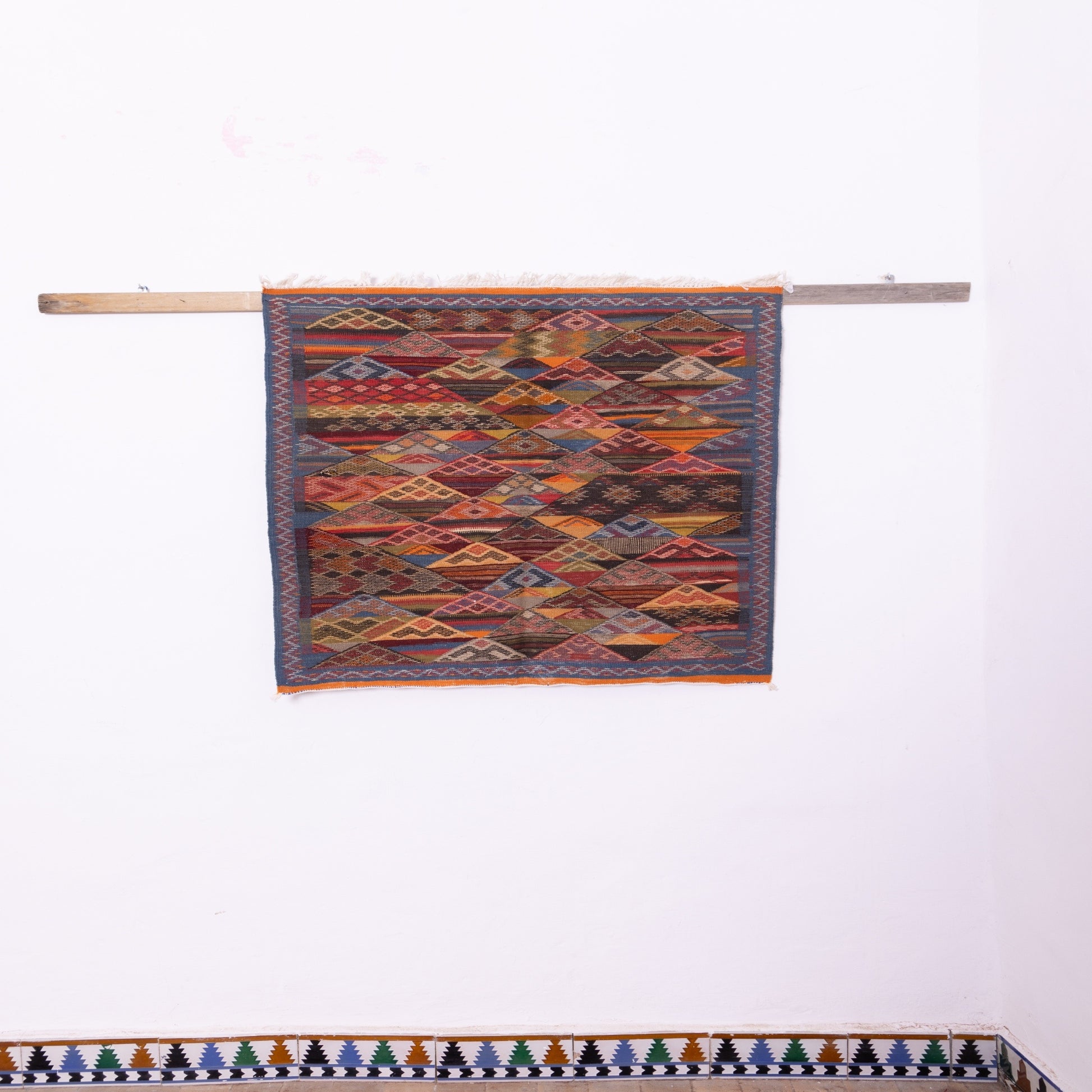 Infuse your home with the magic of Moroccan craftsmanship with this stunning Akhnif rug. Handwoven by Berber artisans, this unique piece boasts a mesmerizing geometric pattern with rich, earthy hues of deep blues, warm reds, and golden yellows, making it a perfect addition to any space.