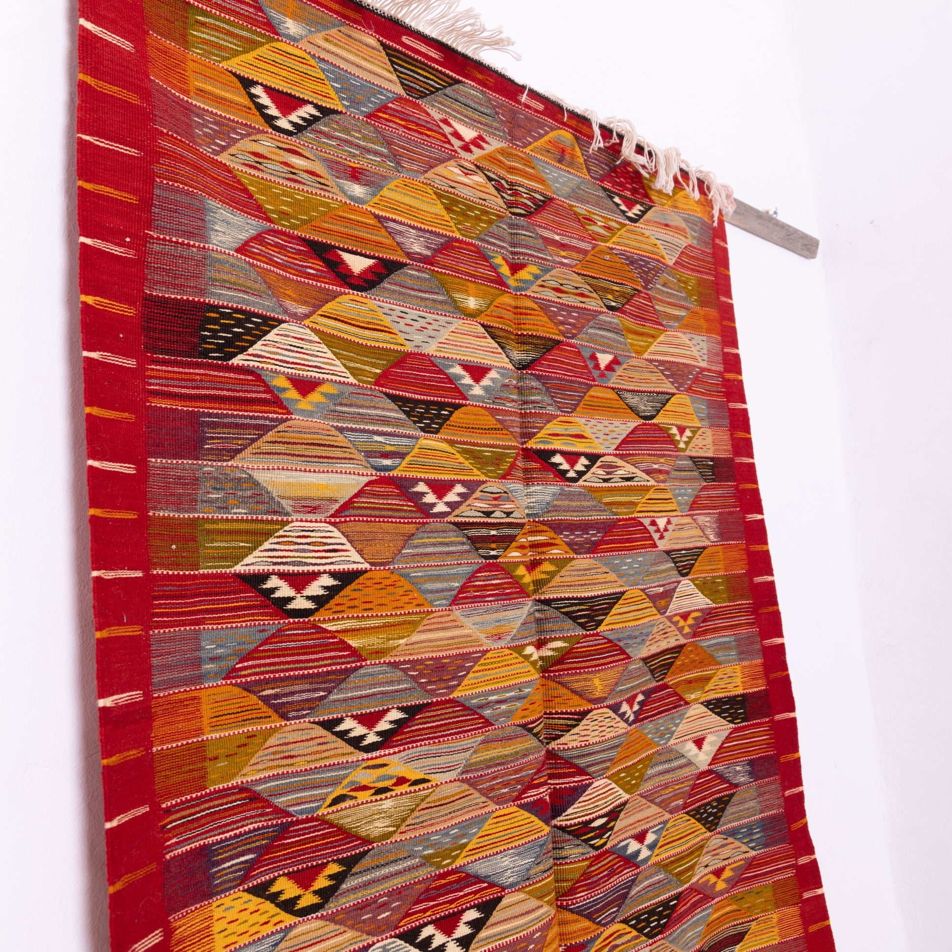 Bring a touch of Moroccan tradition and Berber artistry into your home with this handwoven Akhnif runner, made by skilled artisans from the Atlas Mountains. Featuring a bold geometric pattern in warm red, orange, and earthy tones, this rug is perfect for hallways, entryways, or as a decorative wall hanging.
