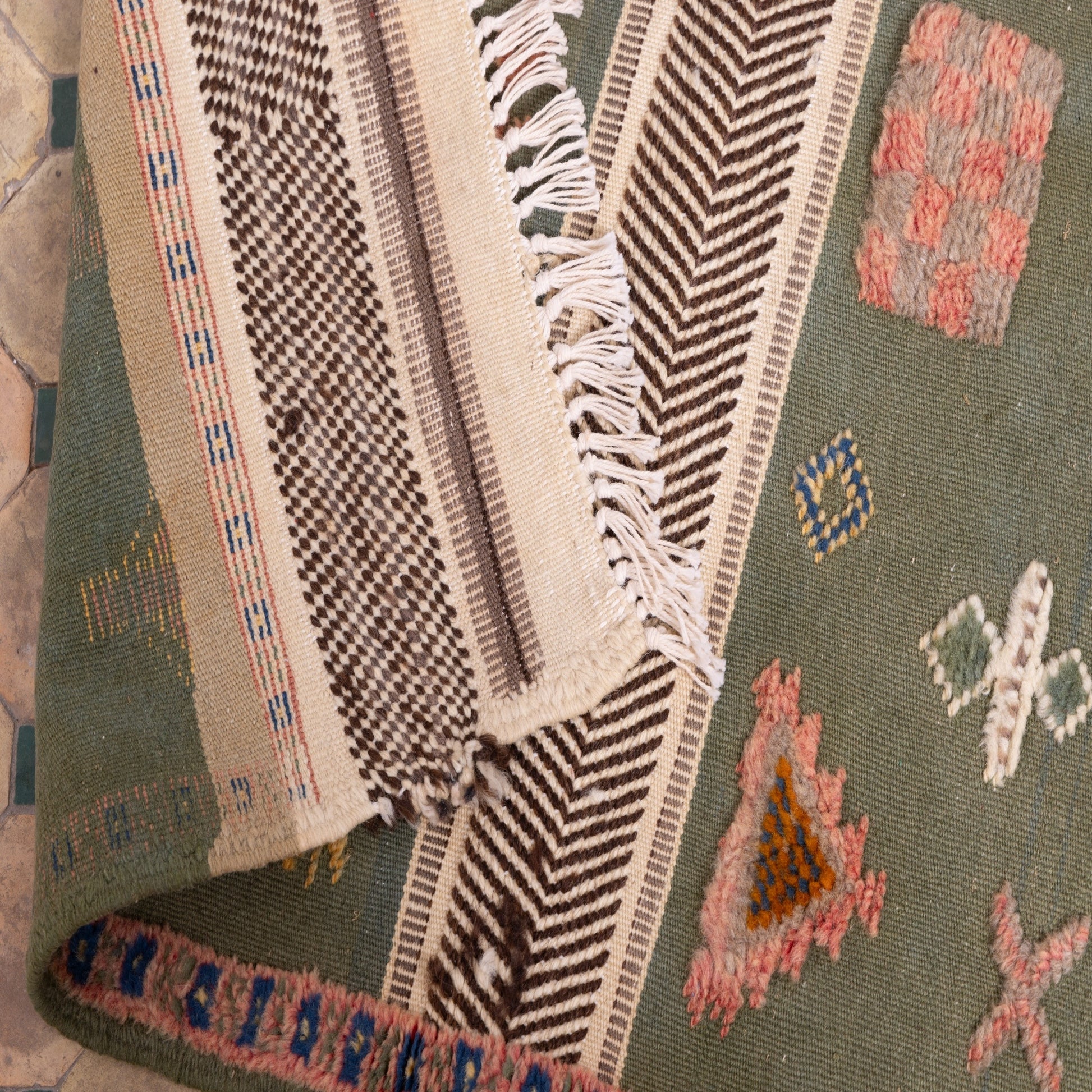 Akhnif rugs are known for their flatweave and embroidered details, originating from the High Atlas Mountains of Morocco. Historically used as wearable cloaks, these textiles have evolved into decorative rugs that bring authentic Moroccan artistry into contemporary homes.