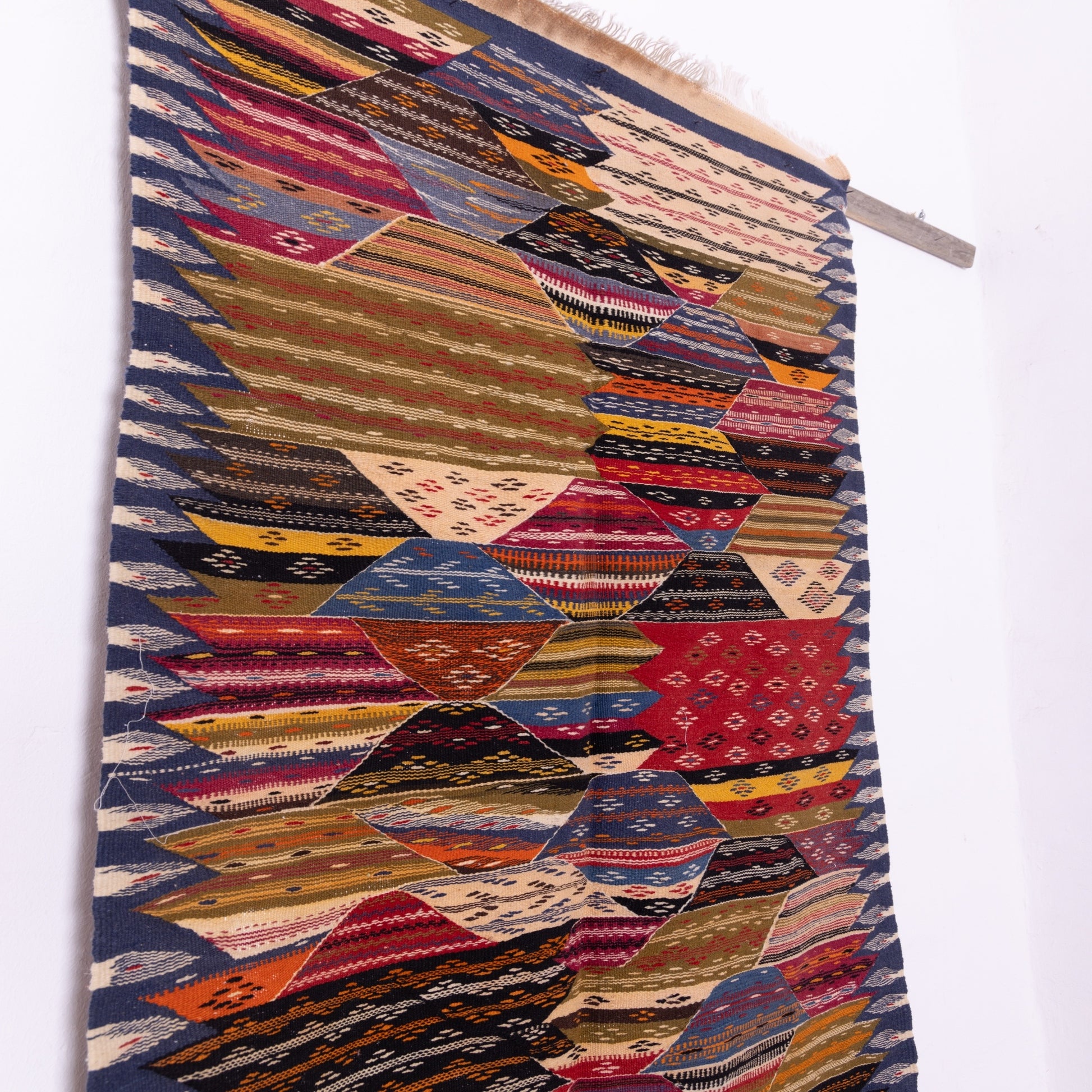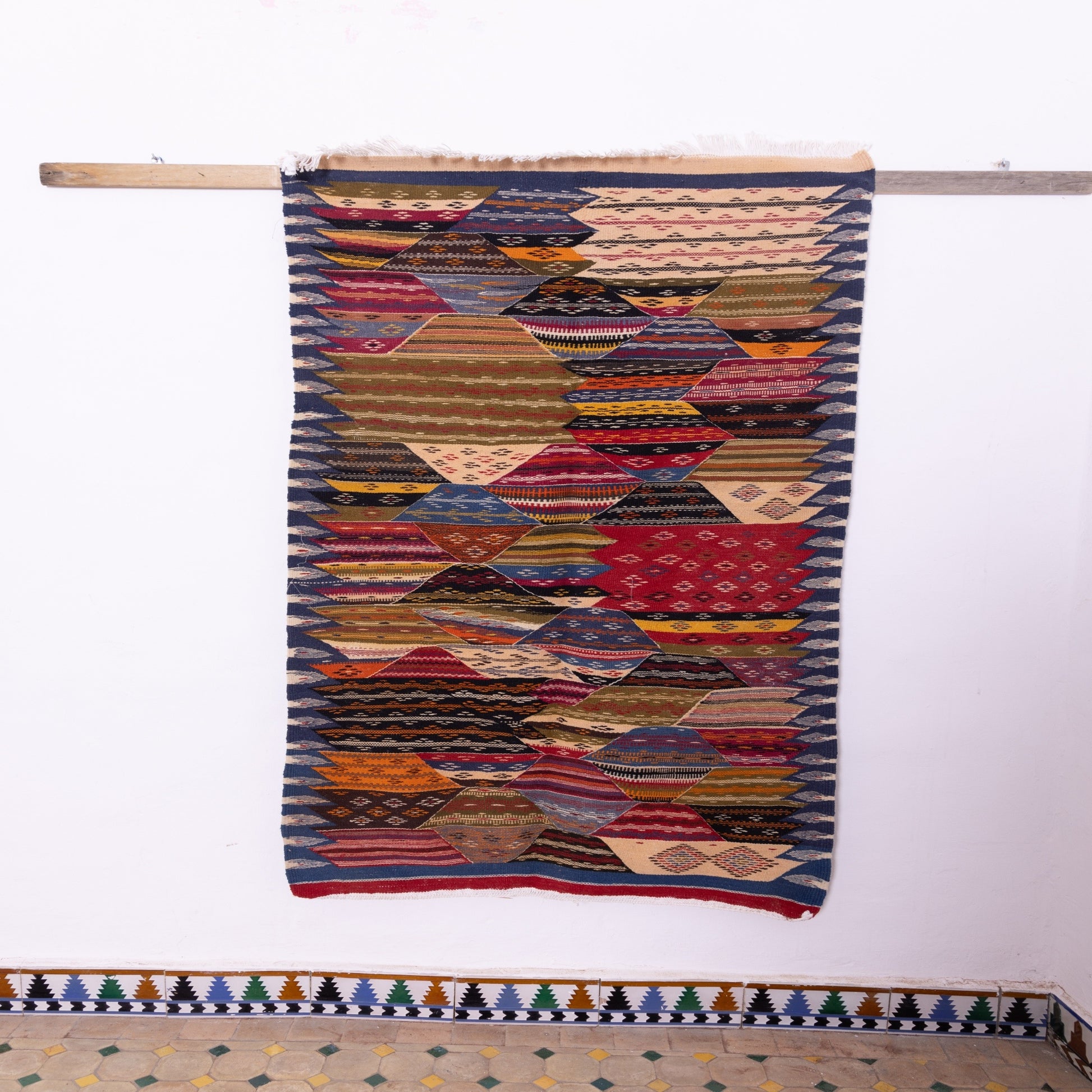 ✔ Rich geometric patchwork design with vibrant tones of red, blue, orange, beige, and earthy hues