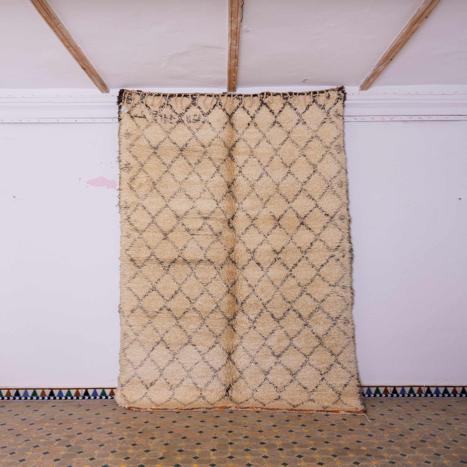 Transform your space with this beautifully handwoven Moroccan Beni Ourain rug, crafted from 100% high-quality natural wool. Its classic diamond lattice pattern in soft, neutral tones reflects the centuries-old craftsmanship of the Berber tribes from the Middle Atlas Mountains of Morocco.