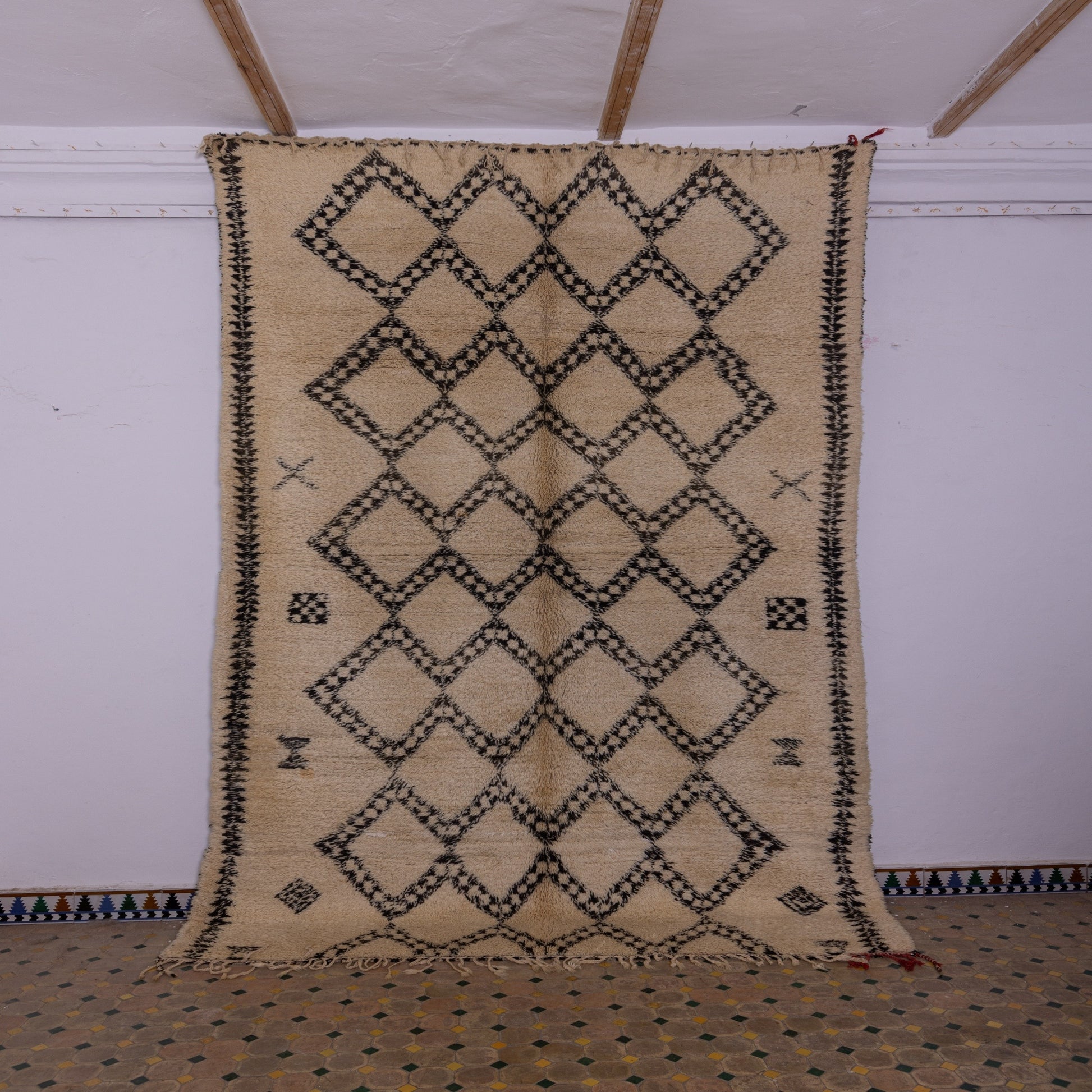 This one-of-a-kind rug features a classic diamond lattice pattern, meticulously woven in deep black against a creamy beige backdrop. The intricate zigzag detailing adds a unique touch, symbolizing protection, harmony, and the connection between the past and future. The geometric motifs, passed down through generations, tell a timeless story of Berber artistry.