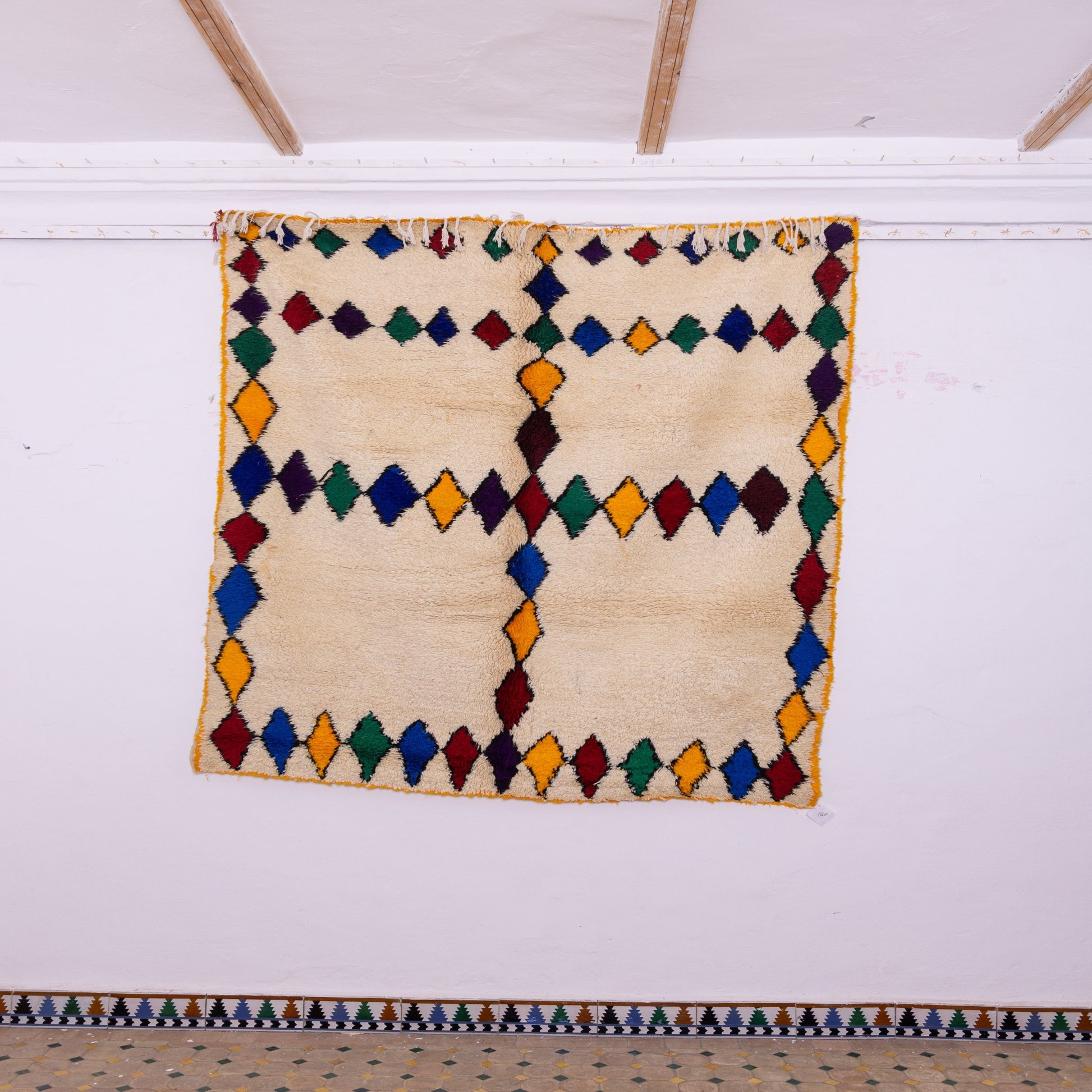 This stunning handwoven Moroccan Azilal rug is a true work of art, crafted by Berber artisans using 100% natural wool. It features a striking geometric diamond pattern, beautifully outlined in a vivid mix of red, blue, yellow, green, and purple hues. The bright, playful colors contrast against a soft, creamy wool background, creating a dynamic yet balanced design that adds warmth and character to any space.