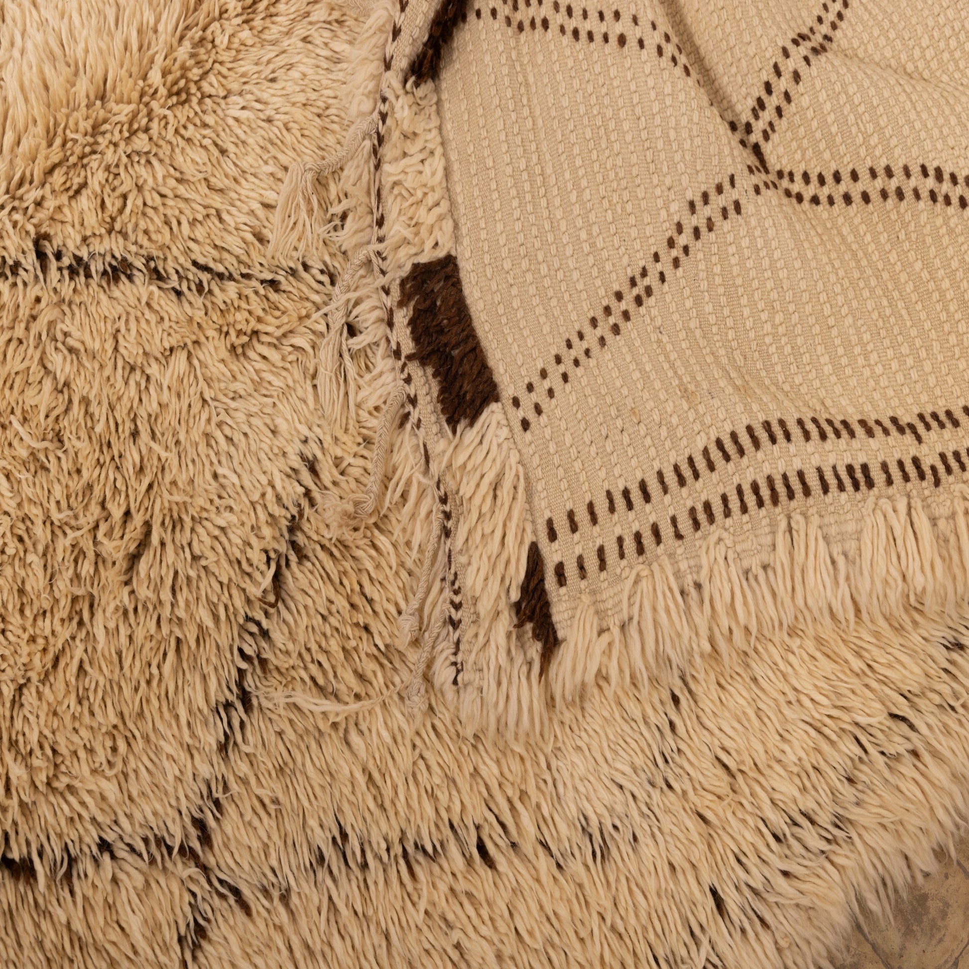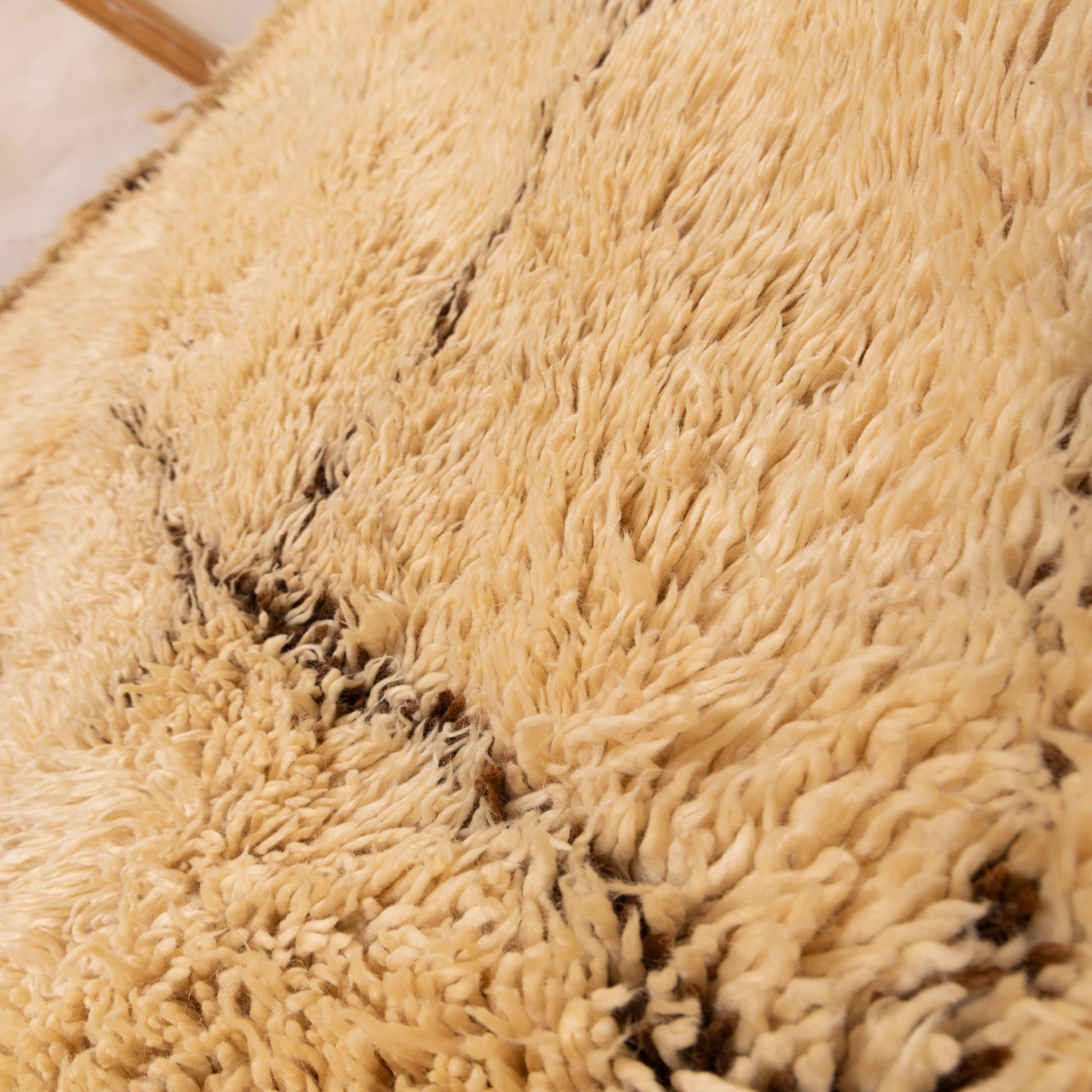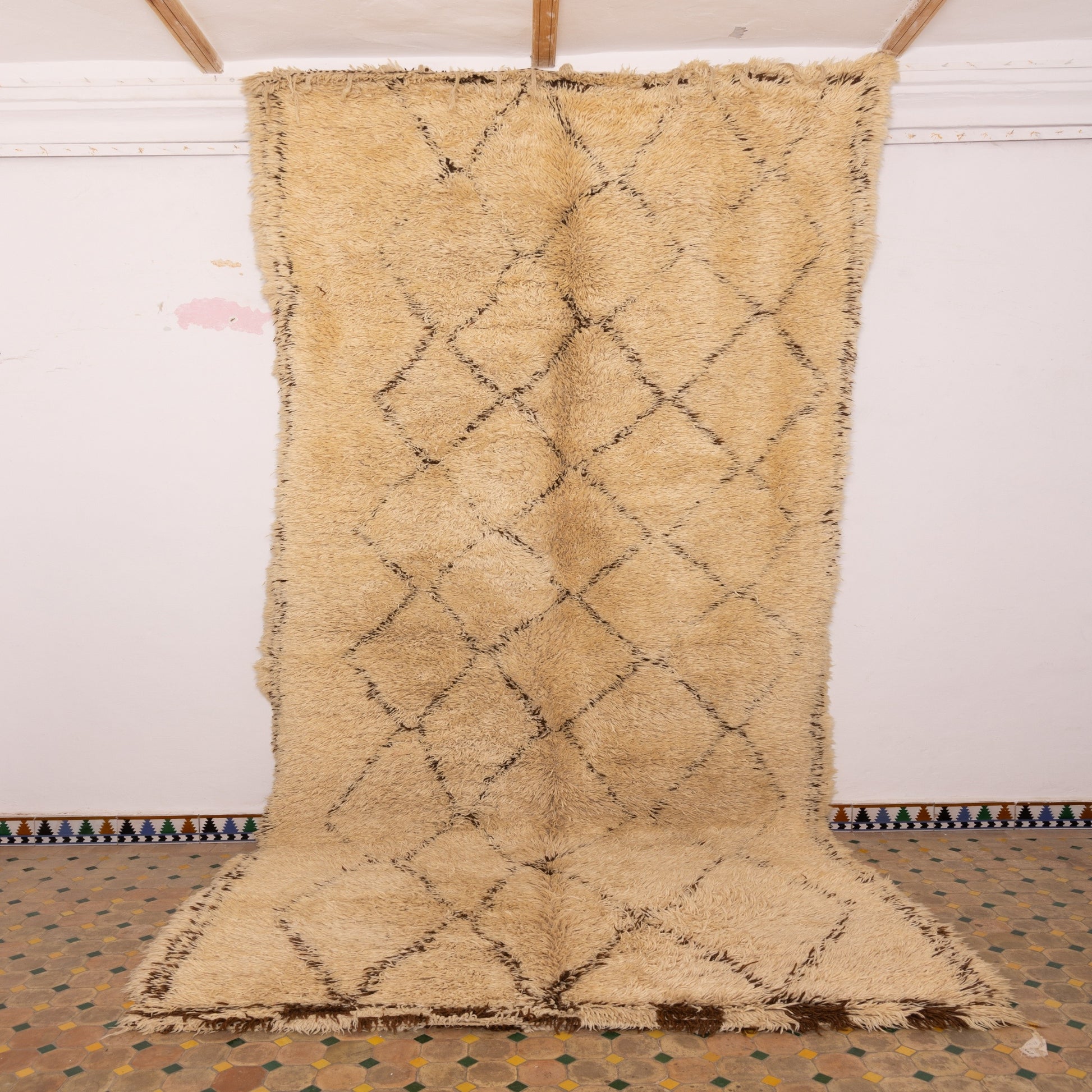 Wrap your space in warmth with this extra plush vintage Beni Ourain rug, handwoven from 100% natural wool by Berber artisans in Morocco. The high-pile texture creates a luxurious, cushioned feel, while the open diamond design and deep golden-beige tones bring in earthy elegance.