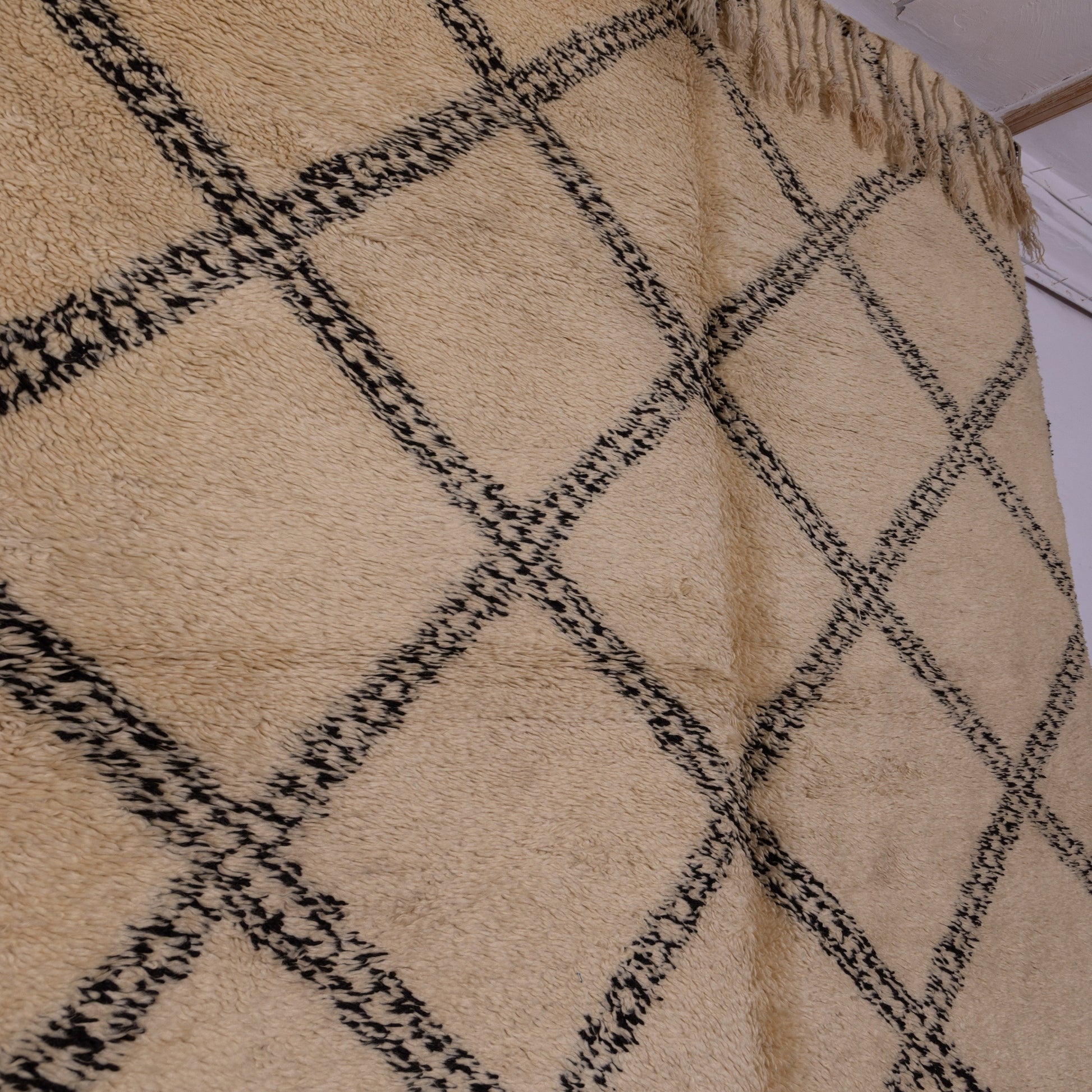 The rug features a classic diamond lattice pattern, a signature of Beni Ourain rugs, symbolizing protection, harmony, and connection to nature. Each knot is meticulously crafted by skilled artisans, ensuring the highest quality and durability. The plush, high-pile texture offers an ultra-soft feel underfoot, making it an inviting addition to living rooms, bedrooms, or cozy lounge spaces.