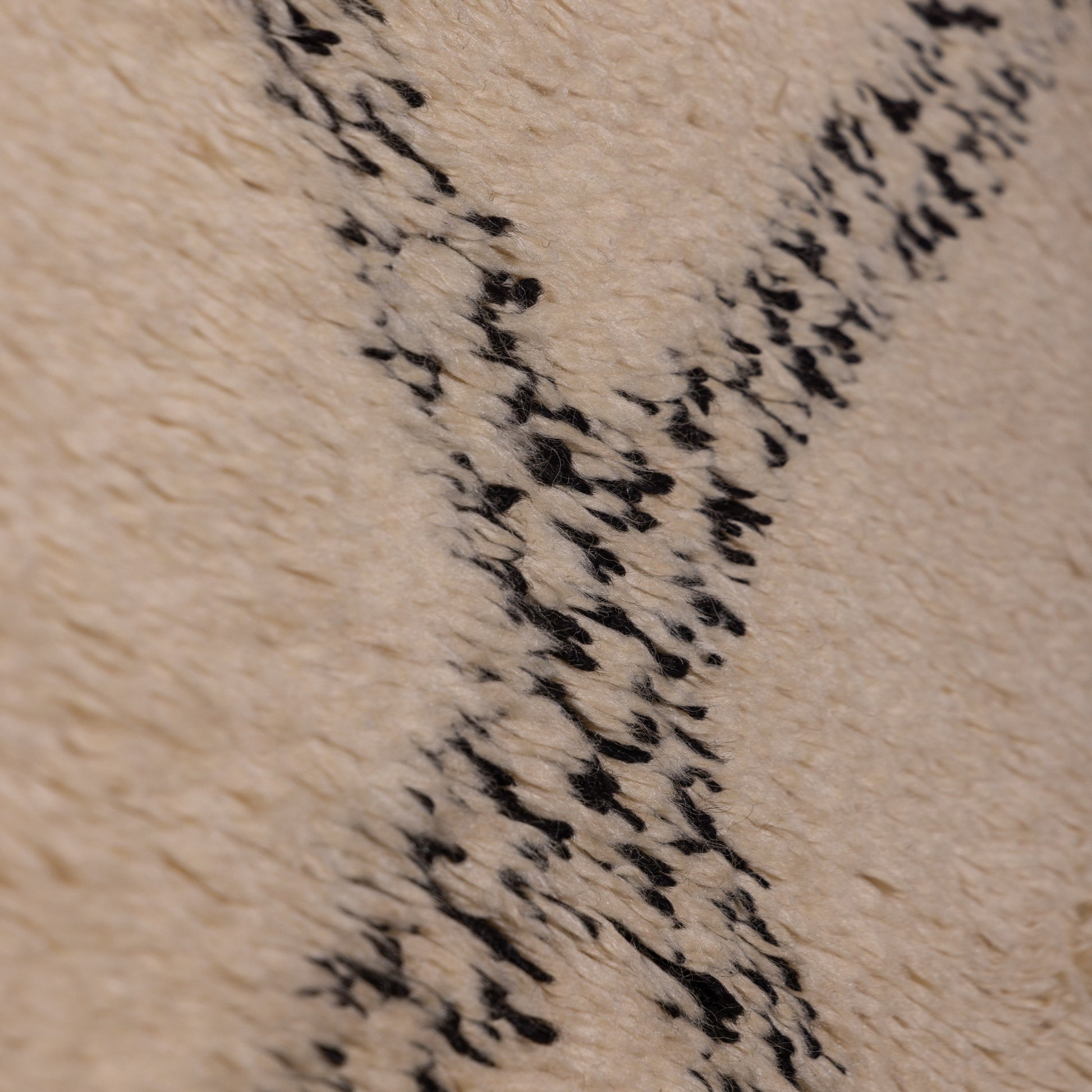The contrasting black and ivory tones create a timeless aesthetic that effortlessly blends with bohemian, Scandinavian, modern, and minimalist decor styles. Whether layered over hardwood floors or placed in a neutral space, this rug adds a touch of warmth, authenticity, and Moroccan charm to any setting.