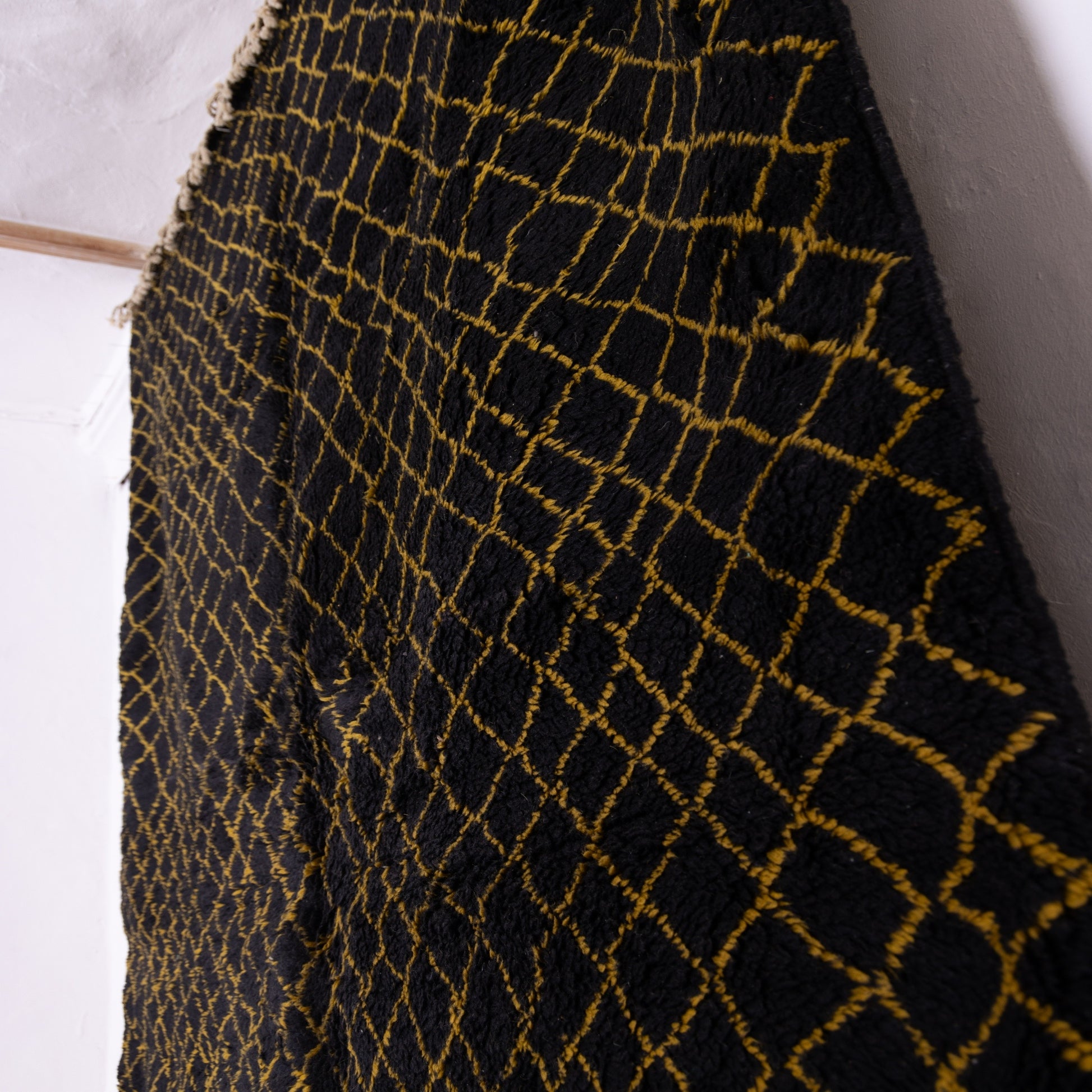 Made from 100% natural wool, it features a striking black base adorned with golden diamond lattice patterns, creating a luxurious and sophisticated design perfect for contemporary interiors.