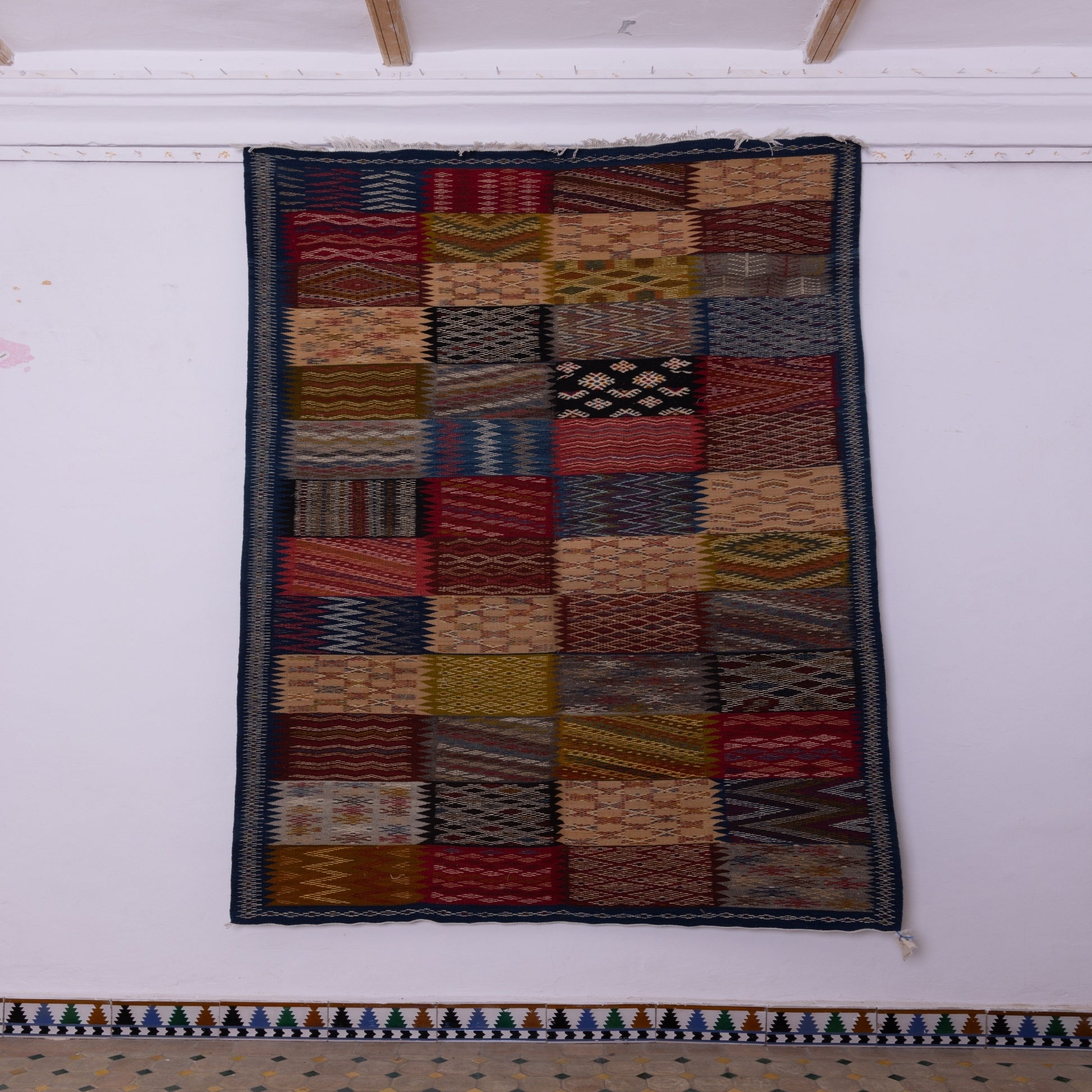 Elevate your home with this stunning Moroccan Akhnif rug, meticulously handwoven by skilled Berber artisans. This unique piece features a patchwork of vibrant geometric and tribal motifs, each telling a story of tradition and craftsmanship. With its rich, warm color palette and intricate patterns, this rug is a true work of art that blends seamlessly into bohemian, eclectic, and contemporary interiors.