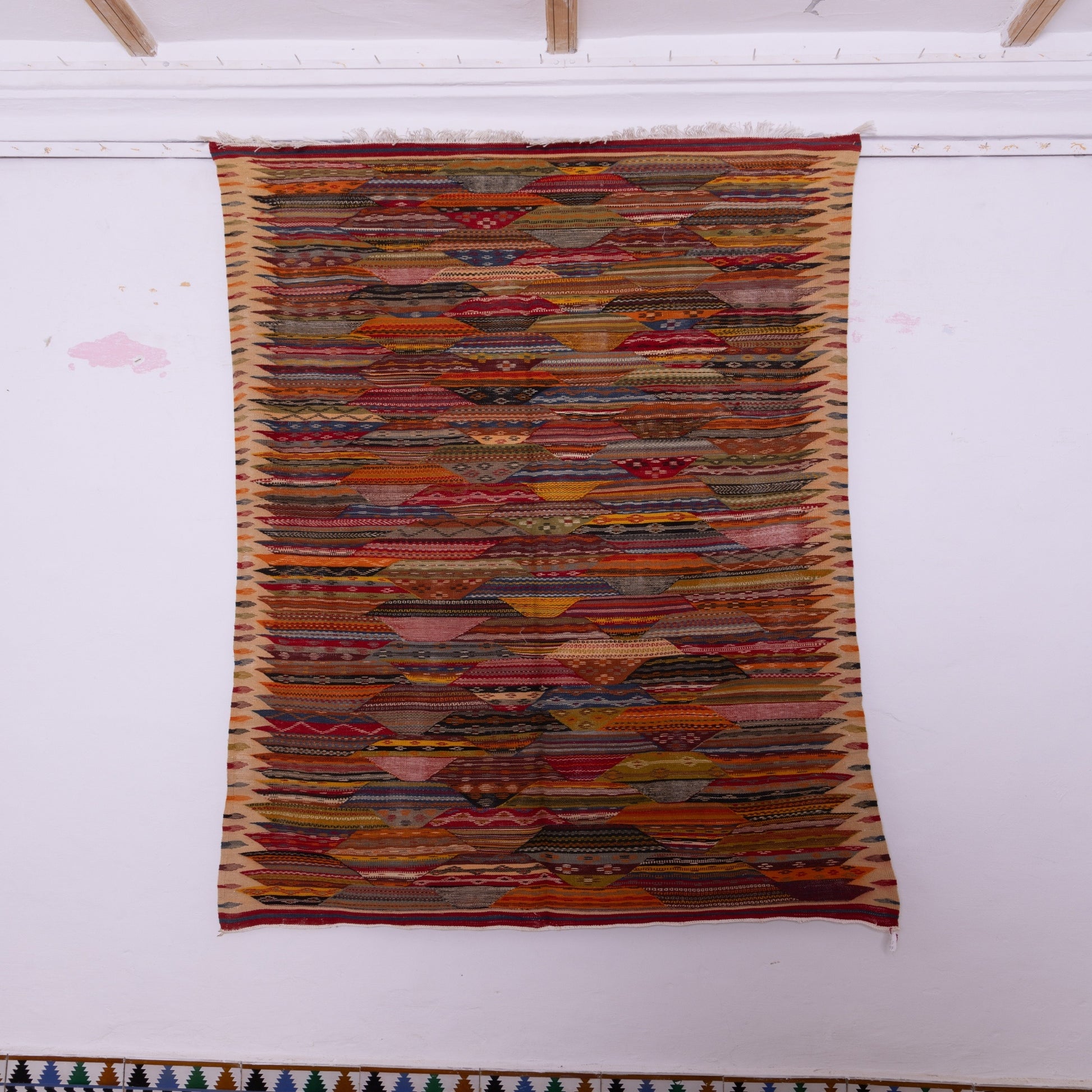 Transform your space with this exquisite Moroccan Akhnif rug, meticulously crafted by skilled Berber artisans. This stunning piece features intricate geometric patterns and rich earthy tones, making it a true statement piece for any interior. The vibrant multi-colored tribal motifs and traditional flatweave texture showcase the craftsmanship and cultural heritage of Morocco.