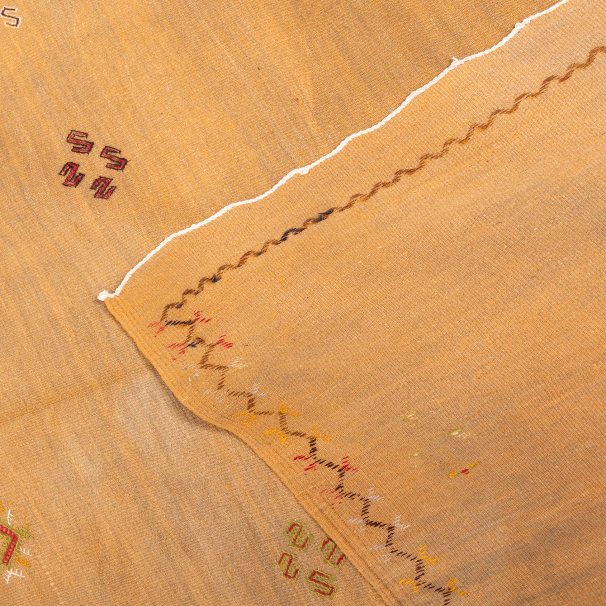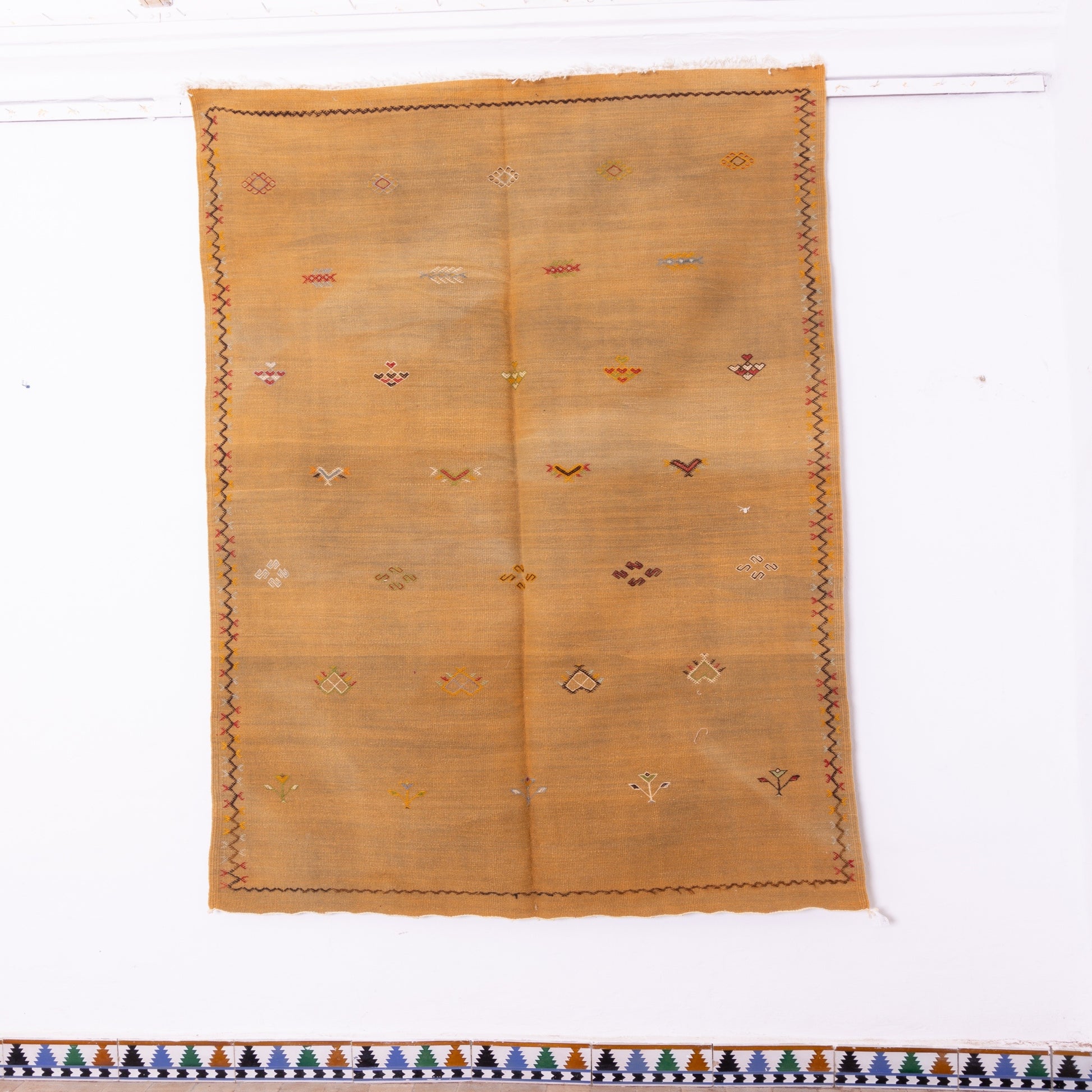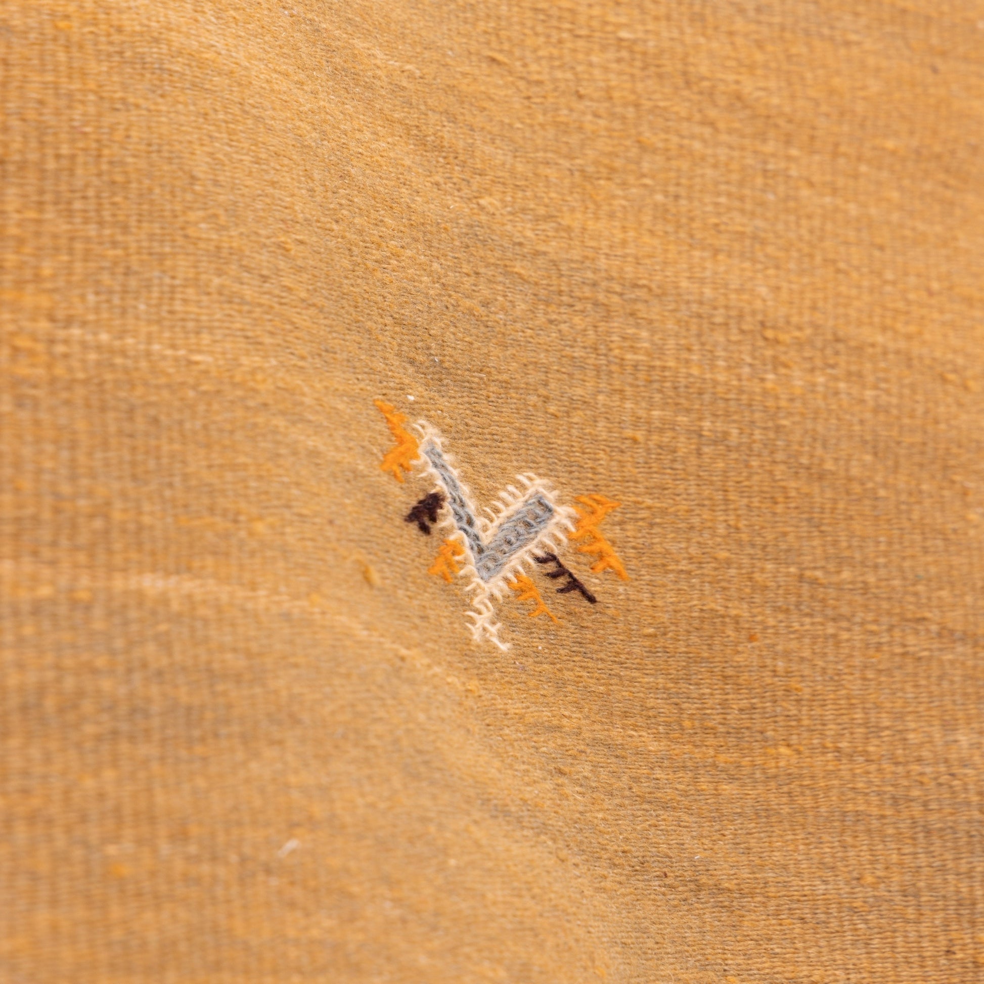 Bring a touch of Moroccan sophistication to your home with this exquisite handwoven Akhnif rug, crafted by Berber artisans using traditional weaving techniques. Featuring a warm golden hue with delicate embroidered tribal symbols, this rug is a minimalist yet artistic statement piece.