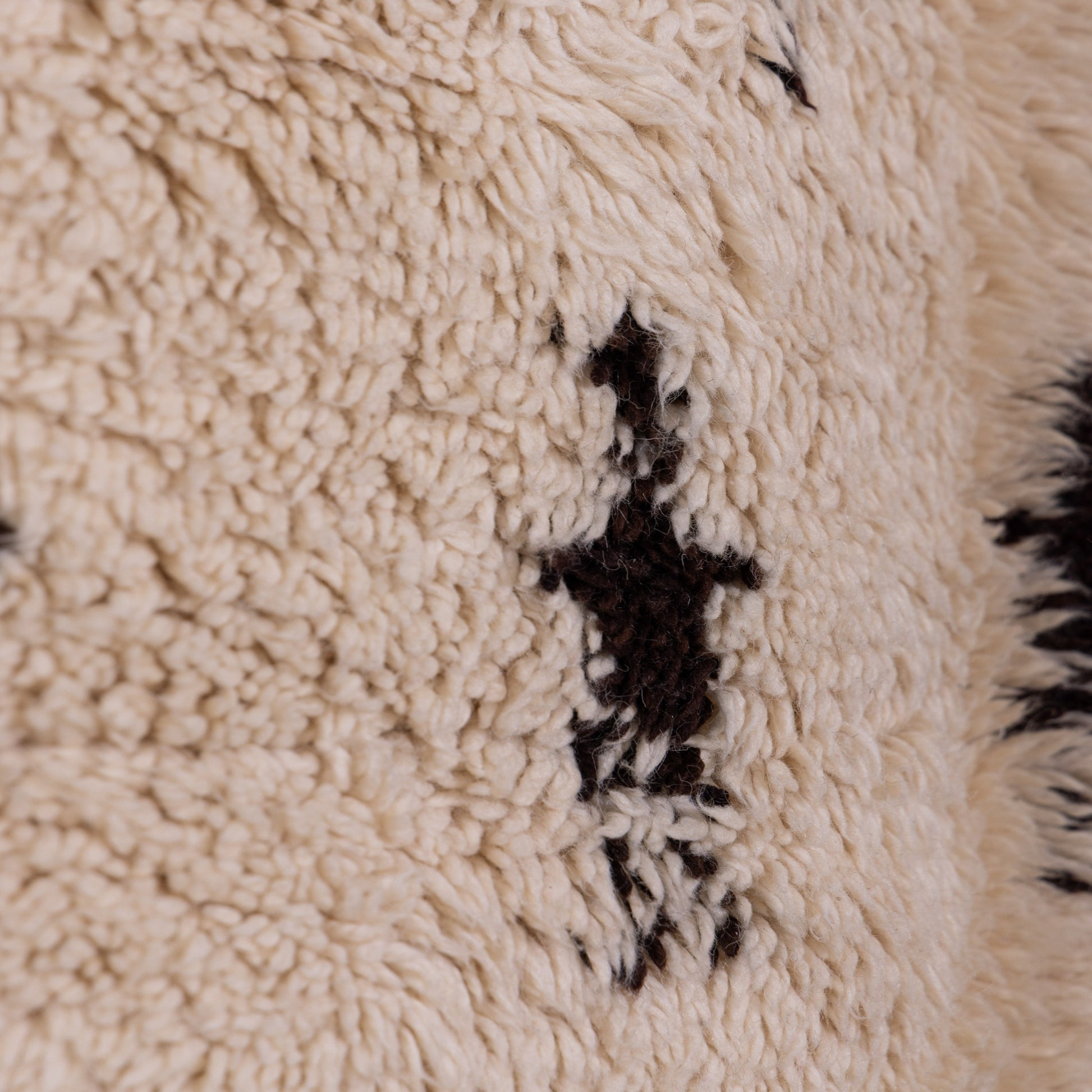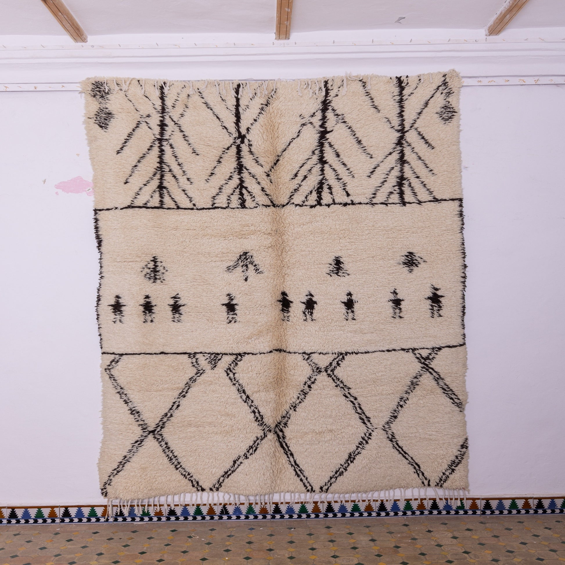 This one-of-a-kind Moroccan Beni Ourain rug is a stunning representation of Berber craftsmanship, featuring three distinct sections of geometric and tribal motifs. The top portion showcases symmetrical abstract patterns, while the middle section is adorned with symbolic human figures, and the bottom half features a classic diamond lattice design. Handwoven by skilled Berber artisans in the Middle Atlas Mountains, this rug is made from 100% natural wool, ensuring durability, softness, and warmth.