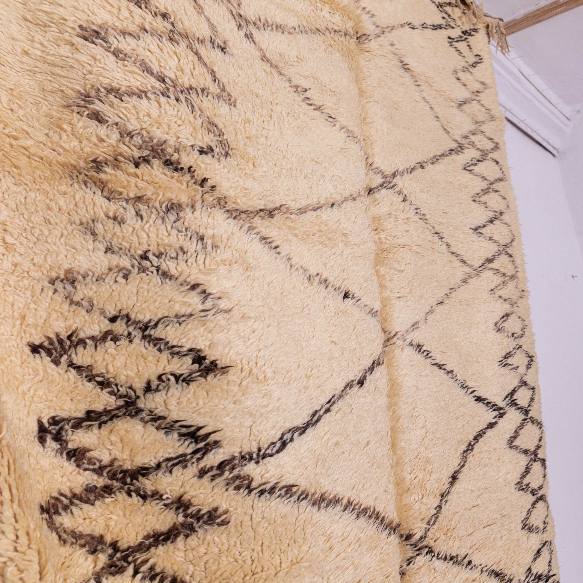 Enhance your living space with this stunning vintage Moroccan Berber rug, handcrafted by Berber artisans from the Middle Atlas region of Morocco. This exquisite piece features a bold geometric diamond design, intricately woven in natural black wool on an ivory background, making it an eye-catching statement piece.