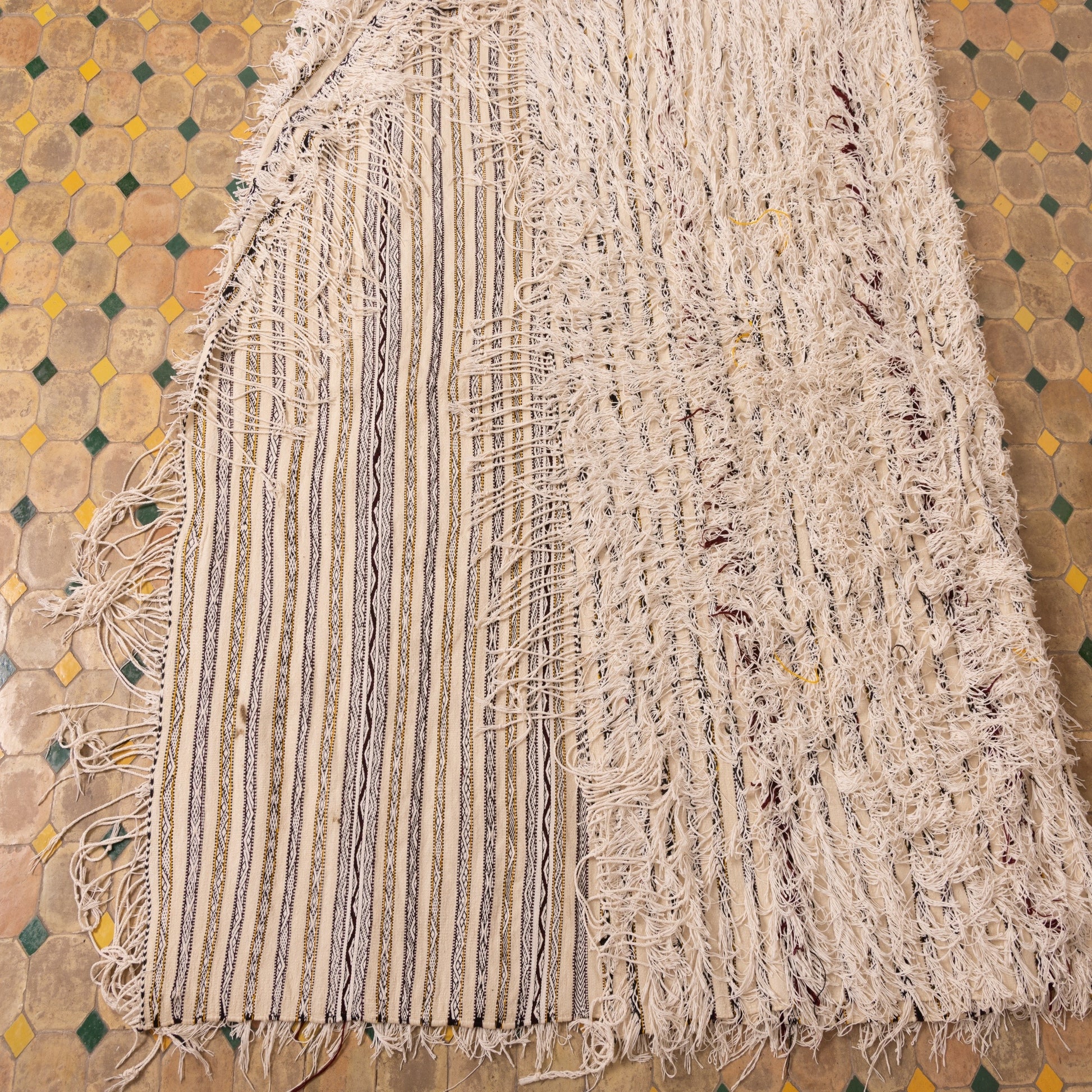 Elevate your home with this stunning handwoven Moroccan Handira Kilim, a true piece of Berber craftsmanship. This vintage striped wool rug is woven with intricate geometric patterns, adding a touch of authenticity and elegance to any space.
