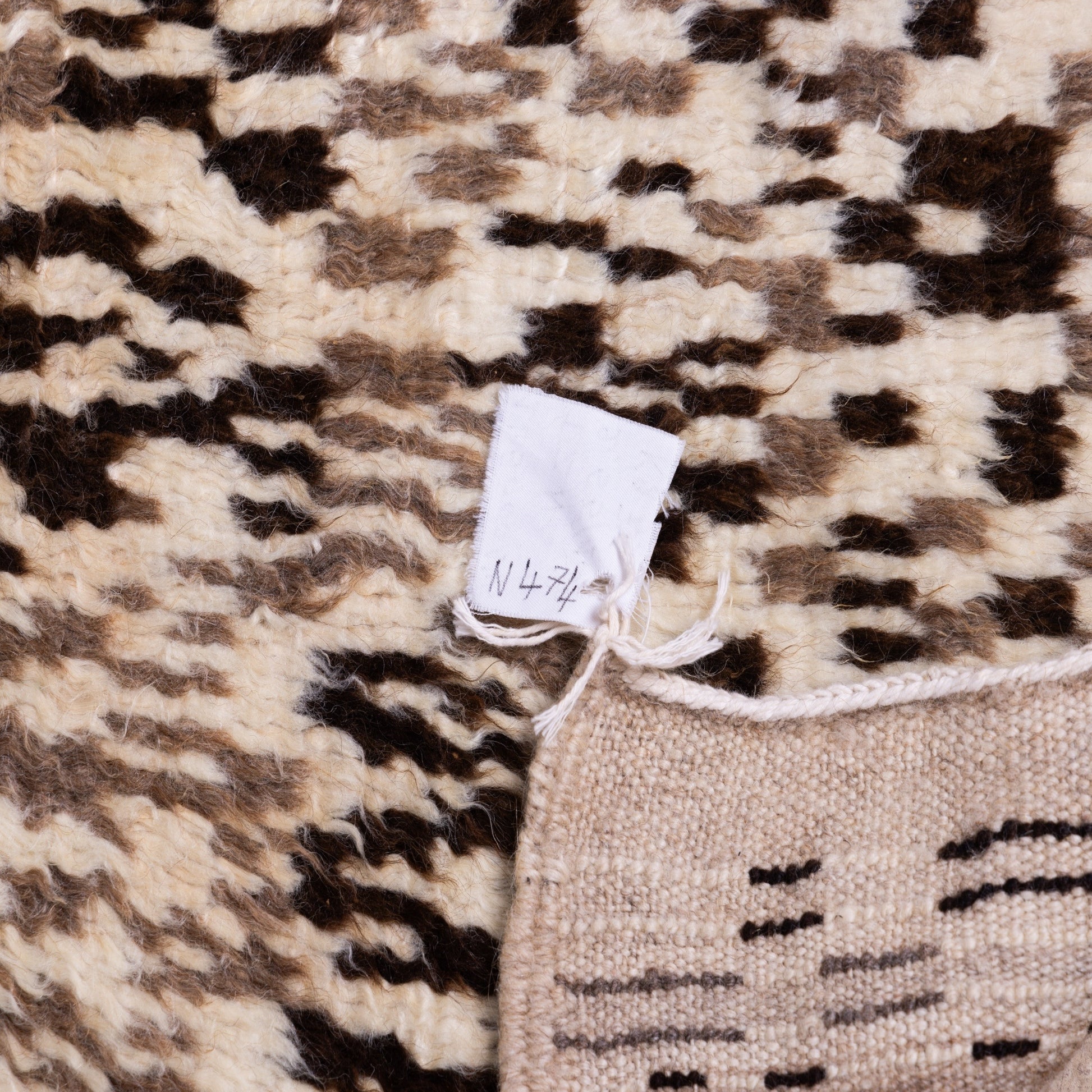 Add a touch of authentic Moroccan craftsmanship to your home with this handwoven Taznakht rug, expertly crafted by Berber artisans using 100% premium wool. This rug showcases a unique abstract black and beige pattern, blending traditional weaving techniques with a modern artistic aesthetic.
