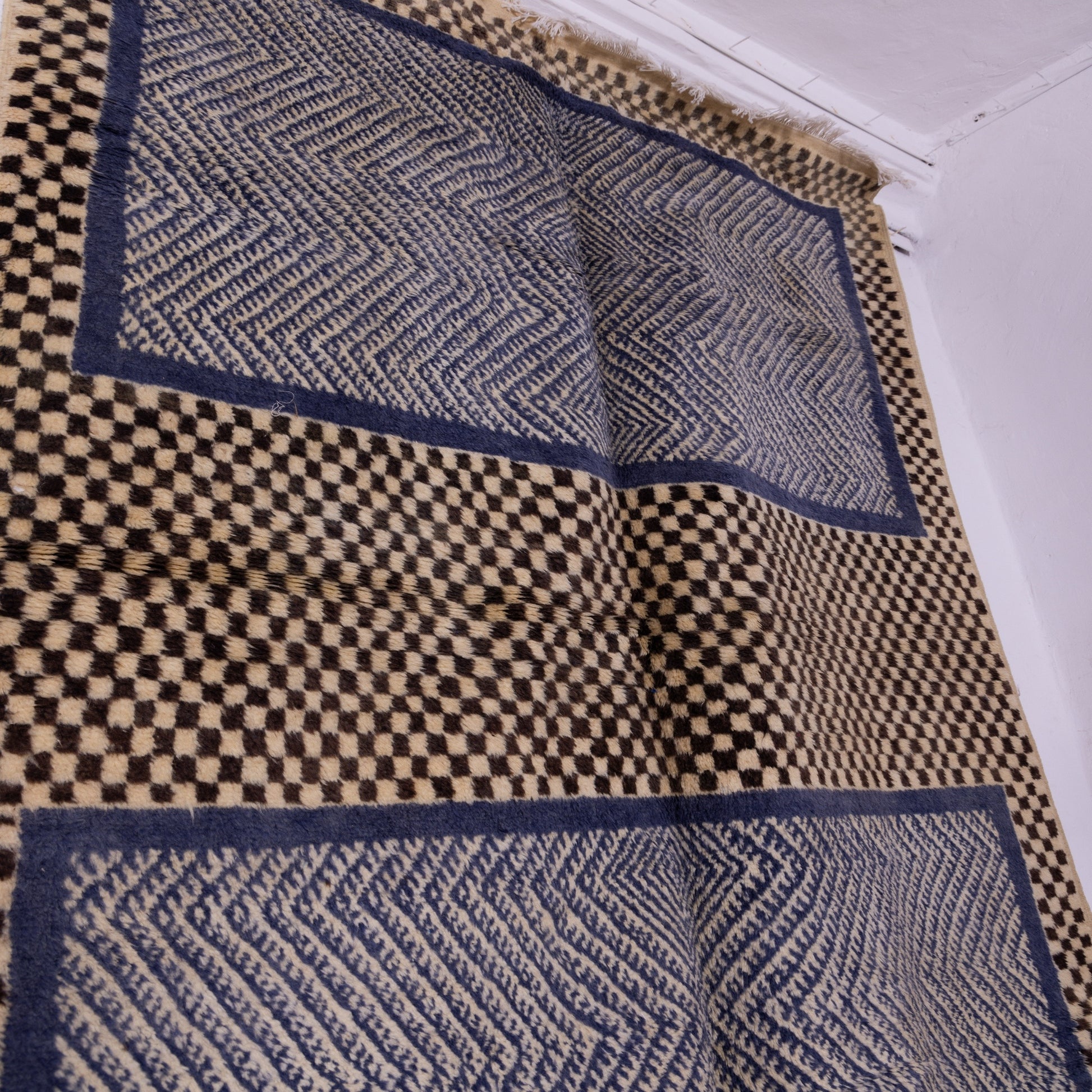 Bring the essence of Moroccan craftsmanship into your home with this handwoven Taznakht rug, crafted from 100% premium wool by skilled Berber artisans. This stunning piece features a classic black and beige checkerboard border, framing two intricately woven blue geometric panels, creating a mesmerizing visual contrast.