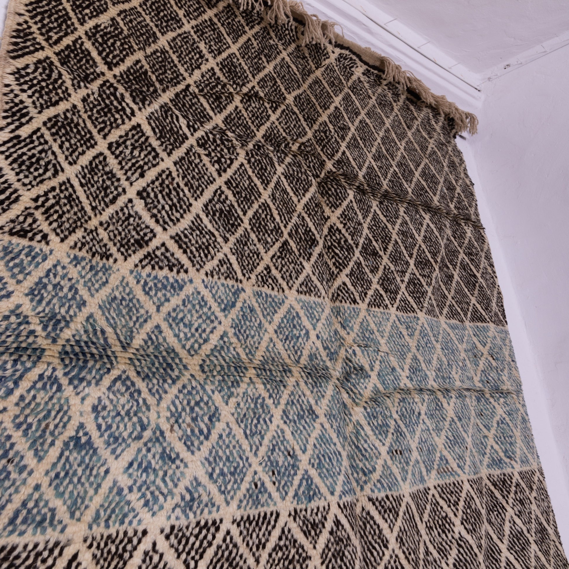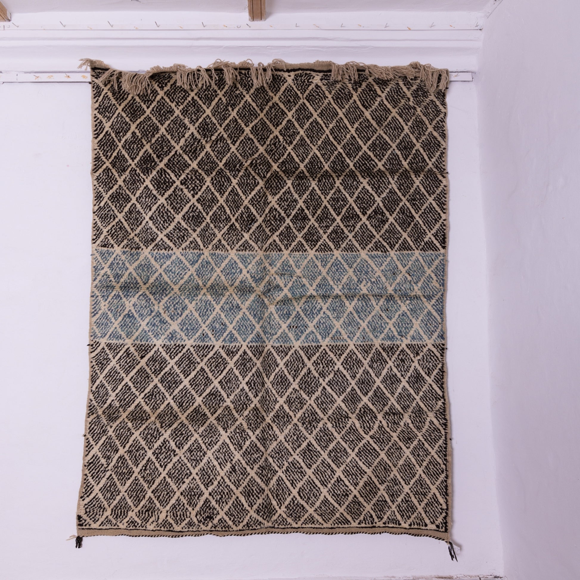 Elevate your home decor with this handwoven Taznakht Moroccan rug, a true masterpiece crafted by skilled Berber artisans using 100% premium wool. This rug features an intricate black and beige diamond lattice pattern, complemented by a unique blue accent band in the center, adding a refined contrast to its traditional design.