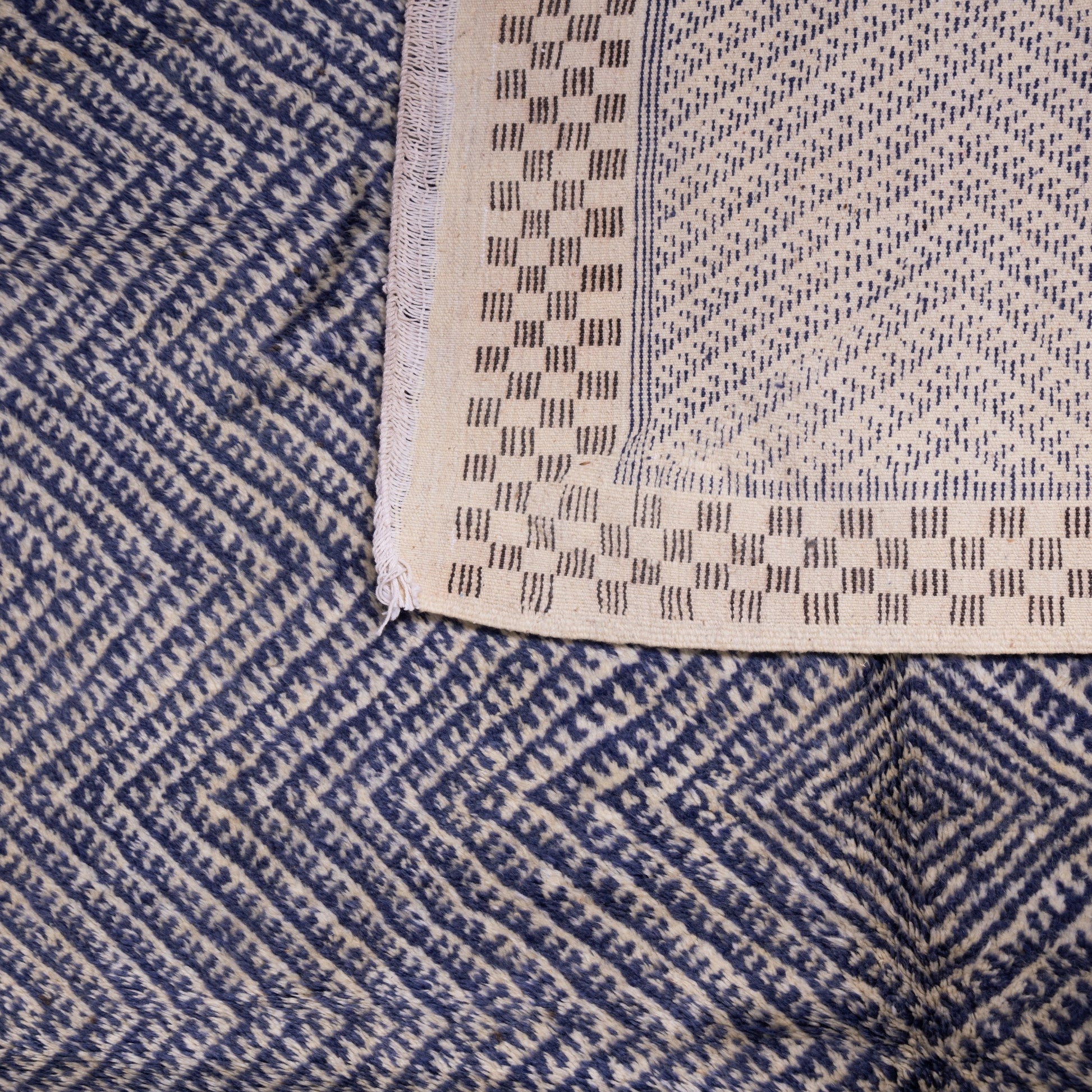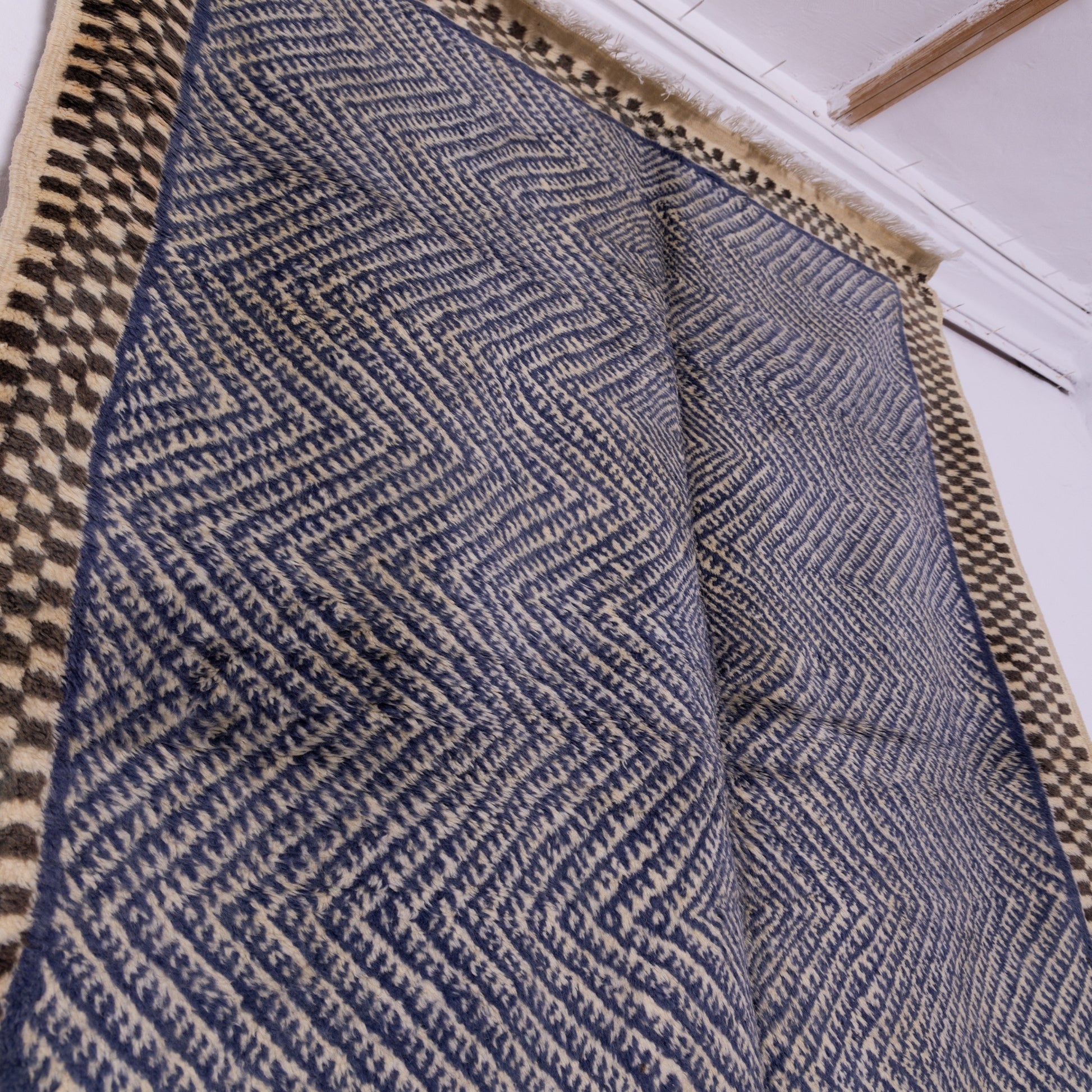 Add a bold and elegant touch to your space with this handwoven Taznakht Moroccan rug, meticulously crafted by Berber artisans from the High Atlas Mountains using 100% premium wool. This rug features a mesmerizing black and blue geometric pattern, framed by a classic checkerboard border, creating a visually striking statement piece.