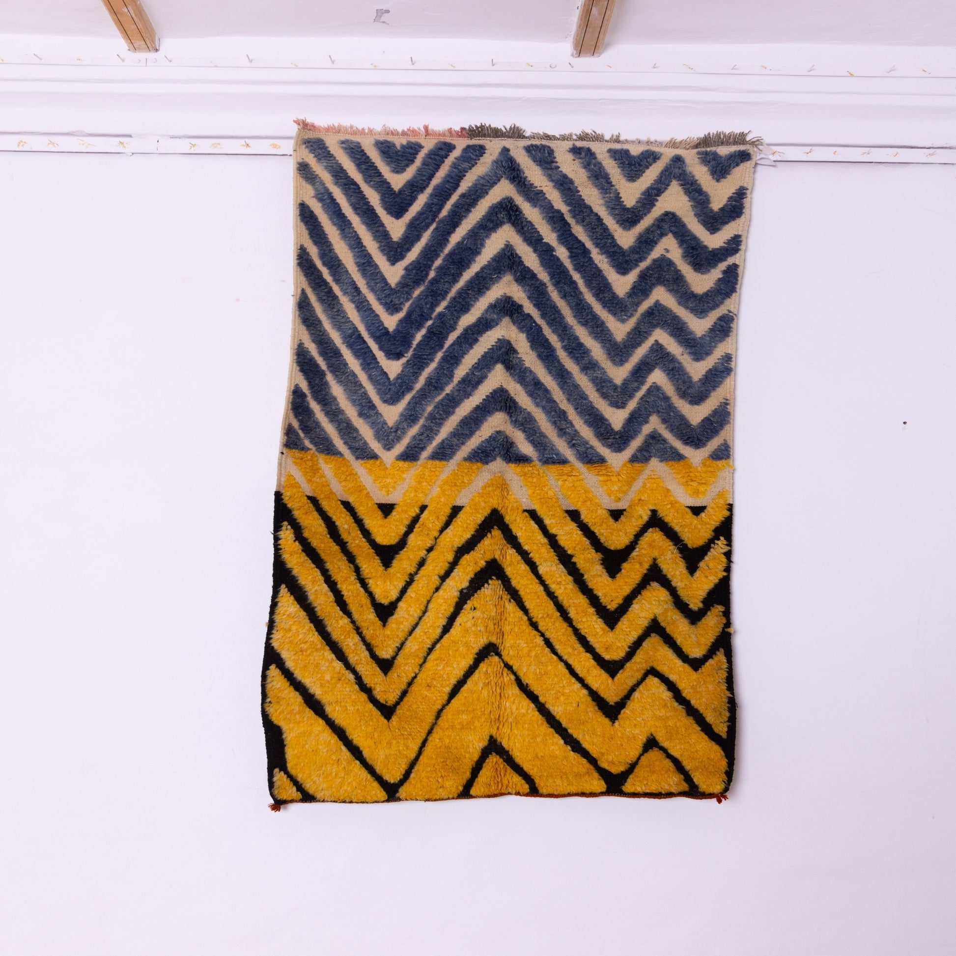 Bring a bold Moroccan statement to your home with this handwoven Taznakht rug, crafted by Berber artisans using 100% premium wool. This stunning piece features a two-tone chevron pattern, with a deep blue upper section transitioning into a vibrant yellow lower section, both accented by striking black geometric lines.