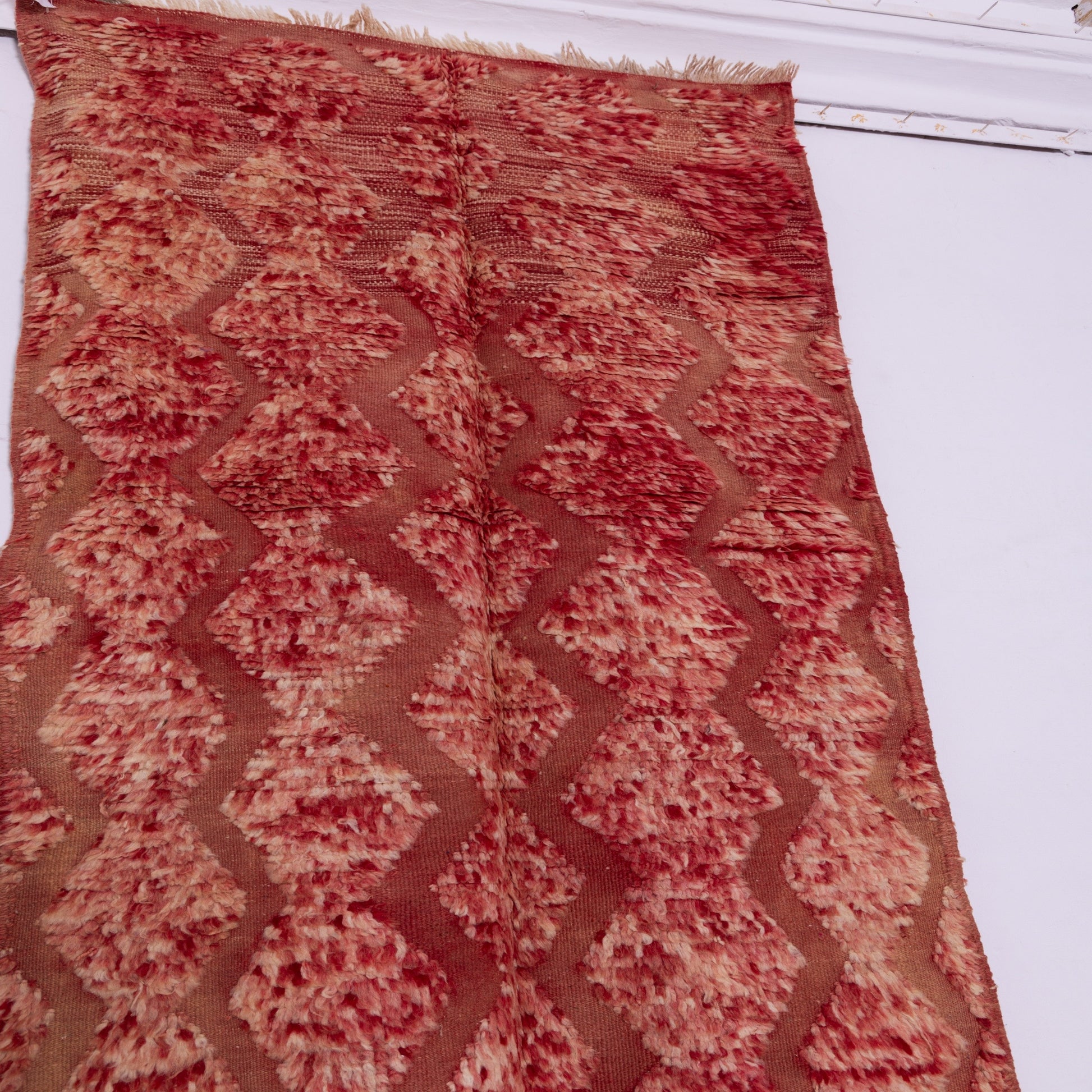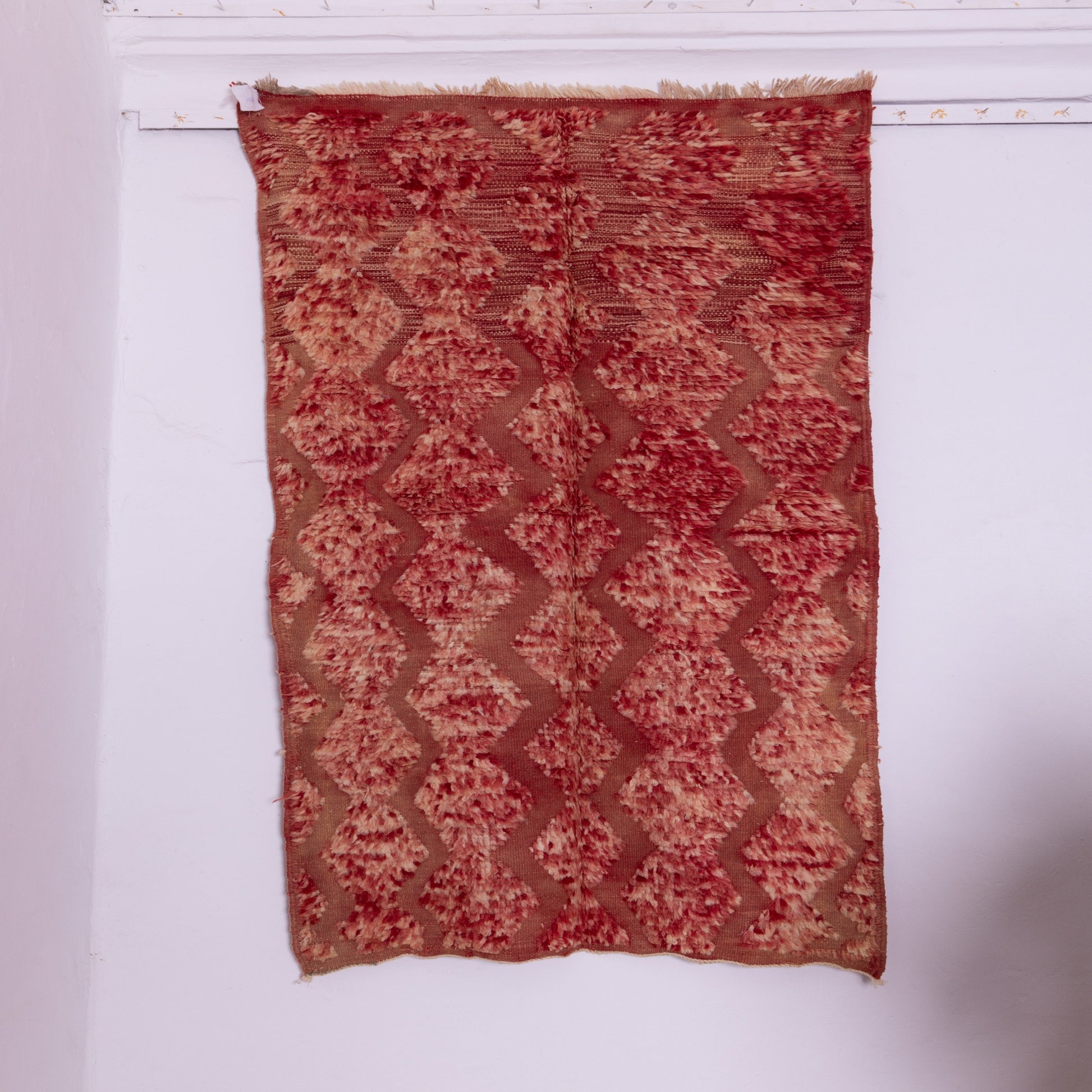 Introduce an element of Moroccan tradition into your home with this stunning handwoven Taznakht rug, crafted with 100% premium wool by Berber artisans from the High Atlas Mountains. This rug features a deep red and beige zigzag pattern, blending rich textures with intricate weaving techniques.