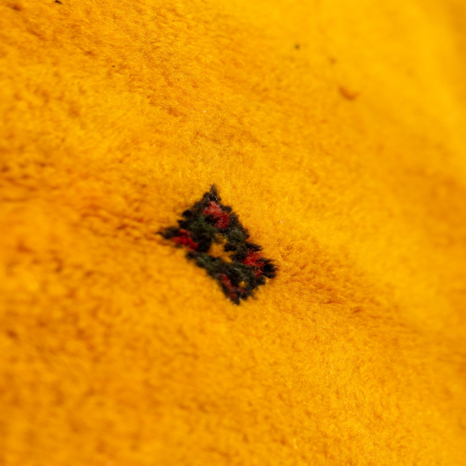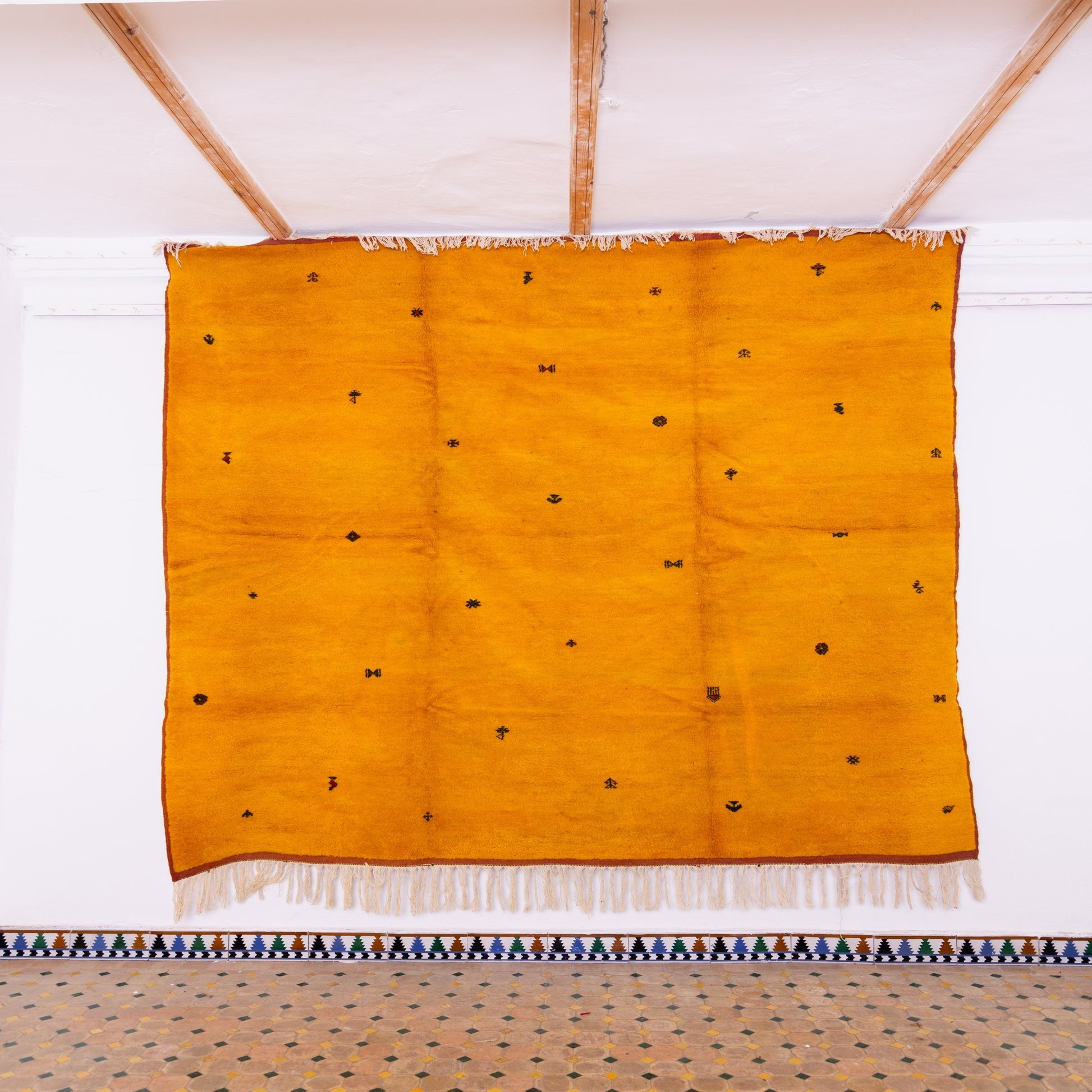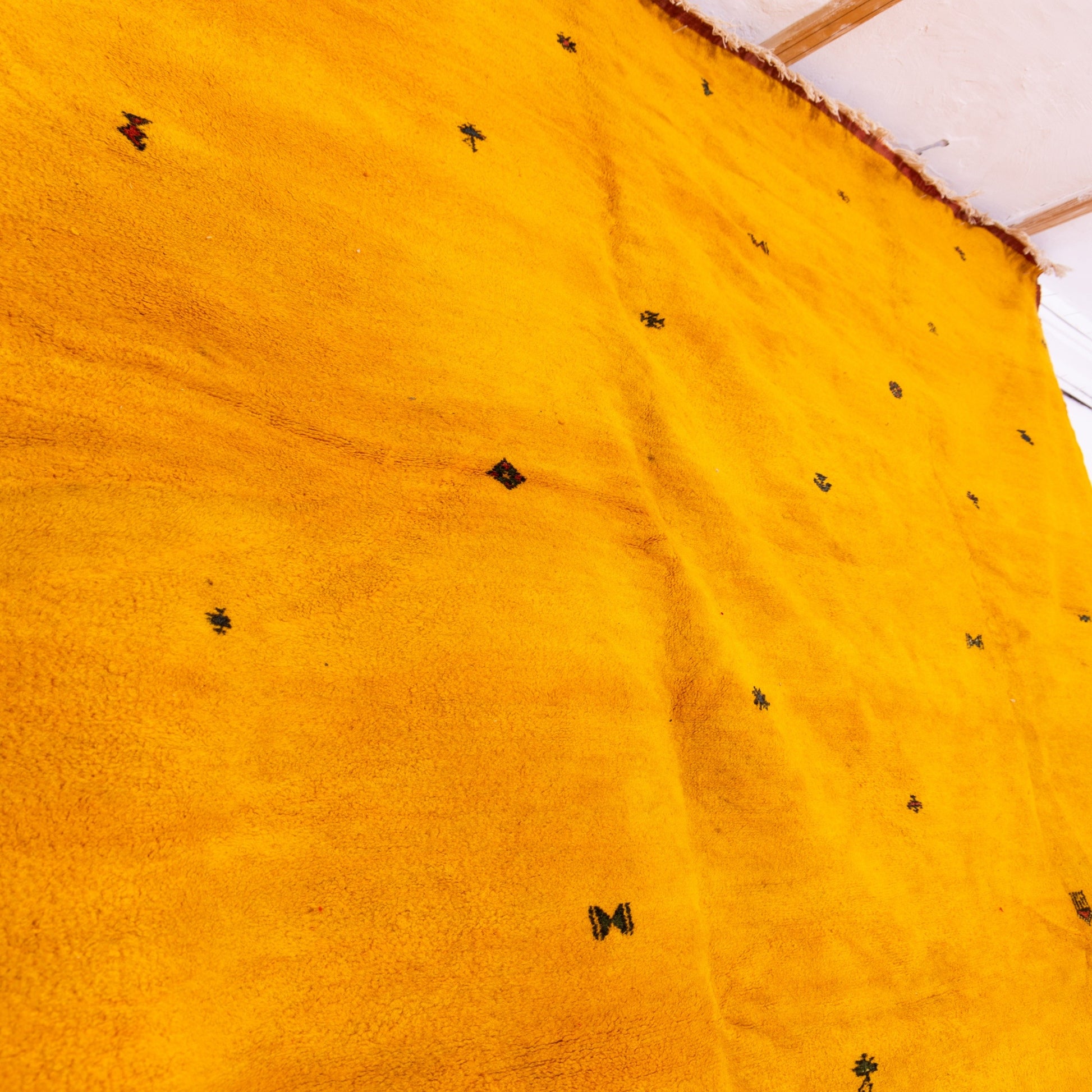 Bring warmth and elegance to your space with this handwoven Taznakht Moroccan rug, crafted by skilled Berber artisans using 70% wool and 30% cotton. This stunning golden yellow rug features a simple yet elegant design, adorned with delicate traditional Berber symbols, each carrying deep cultural significance.