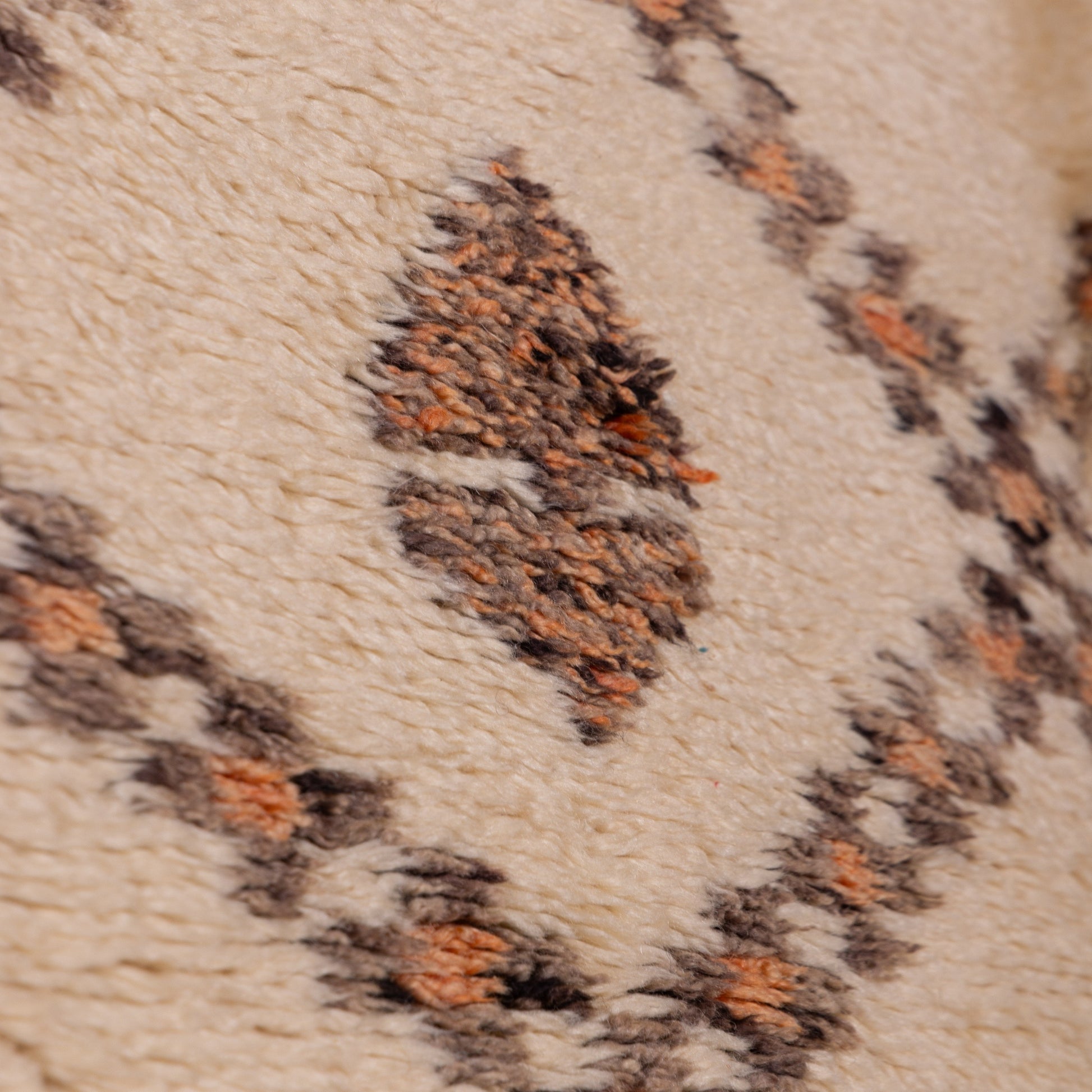 The warm ivory base is beautifully contrasted with earthy brown and terracotta accents, meticulously woven into the design. Each symbol carries meaning, often symbolizing protection, fertility, and the interconnectedness of life. The slightly distressed look and organic imperfections enhance its vintage charm, making it a one-of-a-kind piece filled with history and character.
