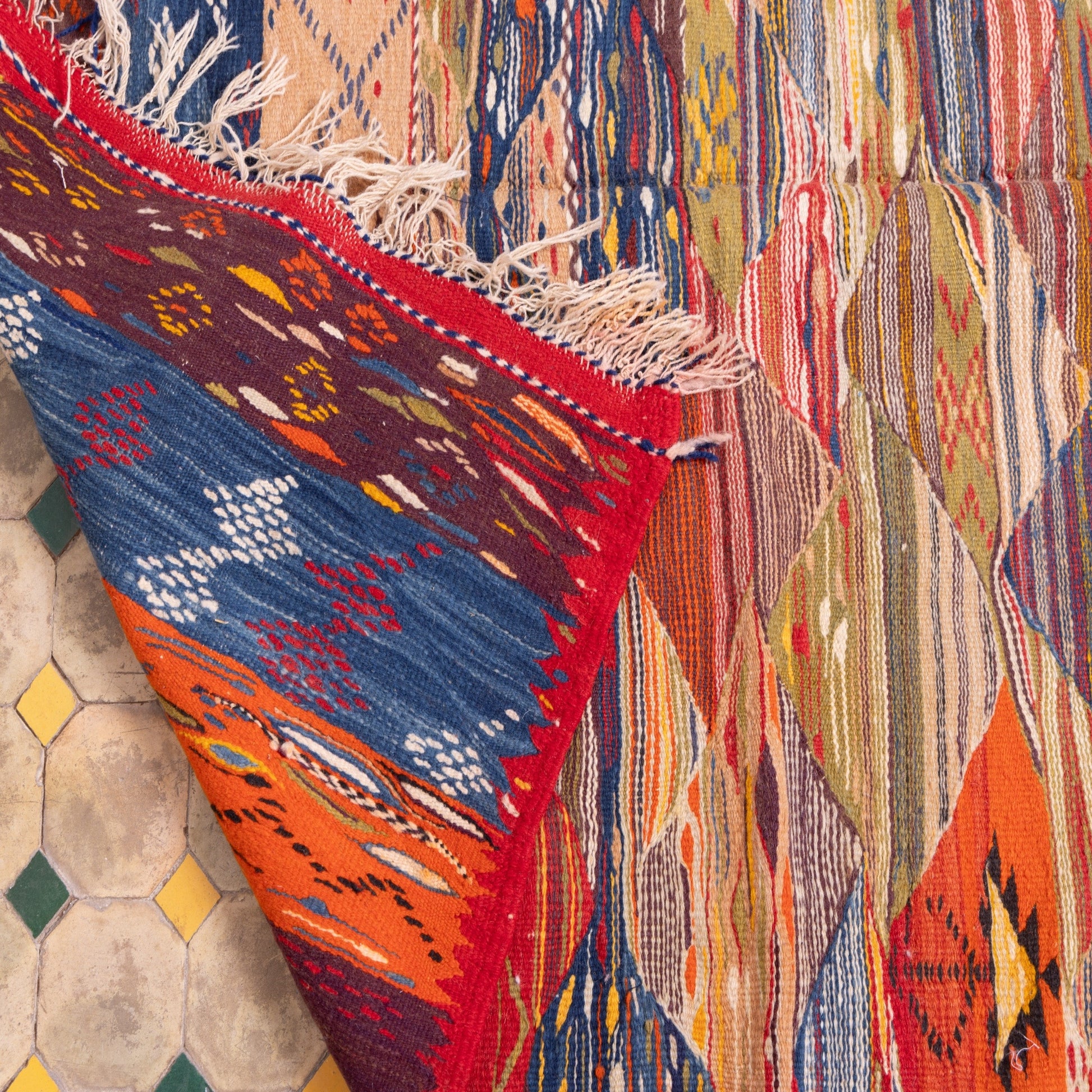 This vibrant and eclectic design showcases bold reds, deep blues, warm beige, and earthy orange tones, harmoniously arranged in geometric patterns that tell a story of Berber heritage. The tribal motifs woven into the fabric symbolize protection, prosperity, and cultural identity.