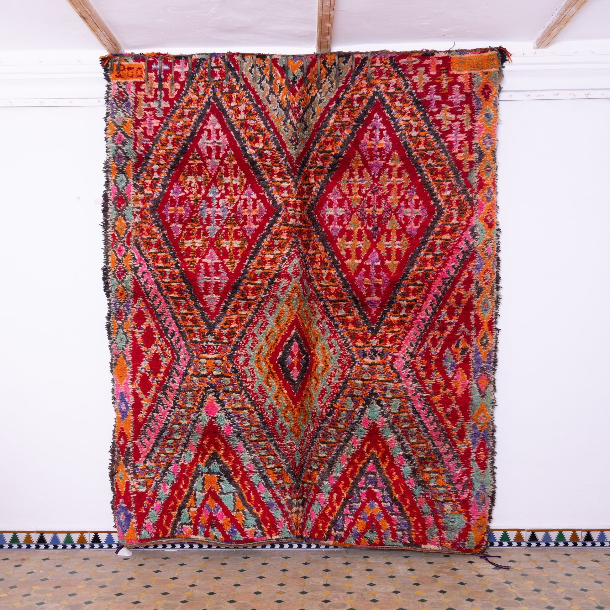 Beni Mguild rugs are highly valued for their dense, warm pile, originally crafted for the colder climates of Morocco. Their bold patterns and deep colors make them a striking addition to any home, whether used as a floor rug or a decorative wall hanging.
