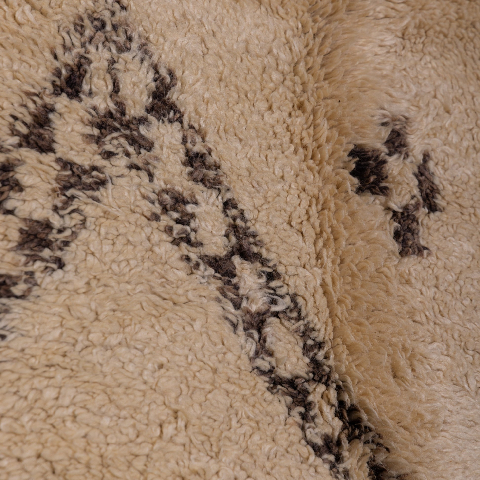 The design features a bold diamond motif intricately woven with natural dark brown wool, symbolizing protection, strength, and unity in Berber culture. The carefully crafted geometric patterns contrast beautifully against the warm, creamy beige wool, adding a sophisticated yet rustic charm to your home.