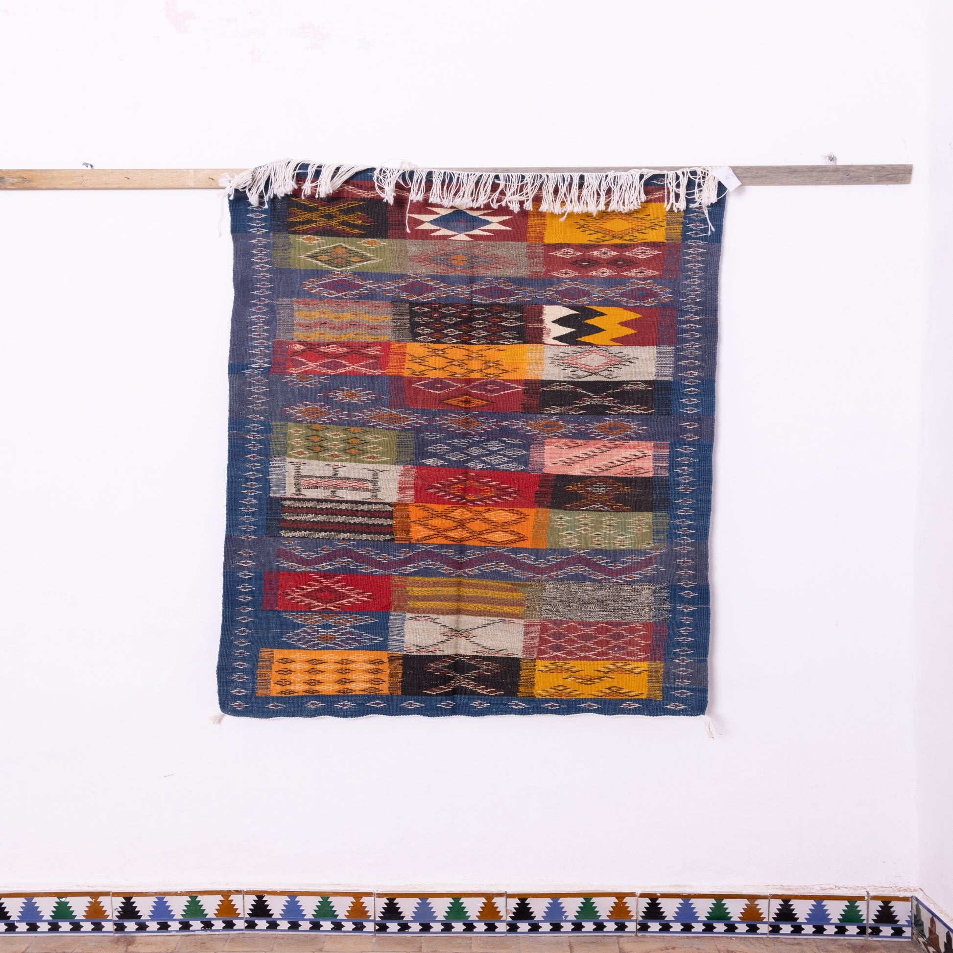 Add a touch of Moroccan charm to your space with this stunning handwoven Akhnif rug, crafted by Berber artisans of the Atlas Mountains. The rug features a patchwork-style geometric pattern, woven with vibrant shades of deep blue, warm orange, earthy browns, and hints of red. This unique design blends traditional Berber motifs with a modern artistic appeal, making it an eye-catching addition to any room.