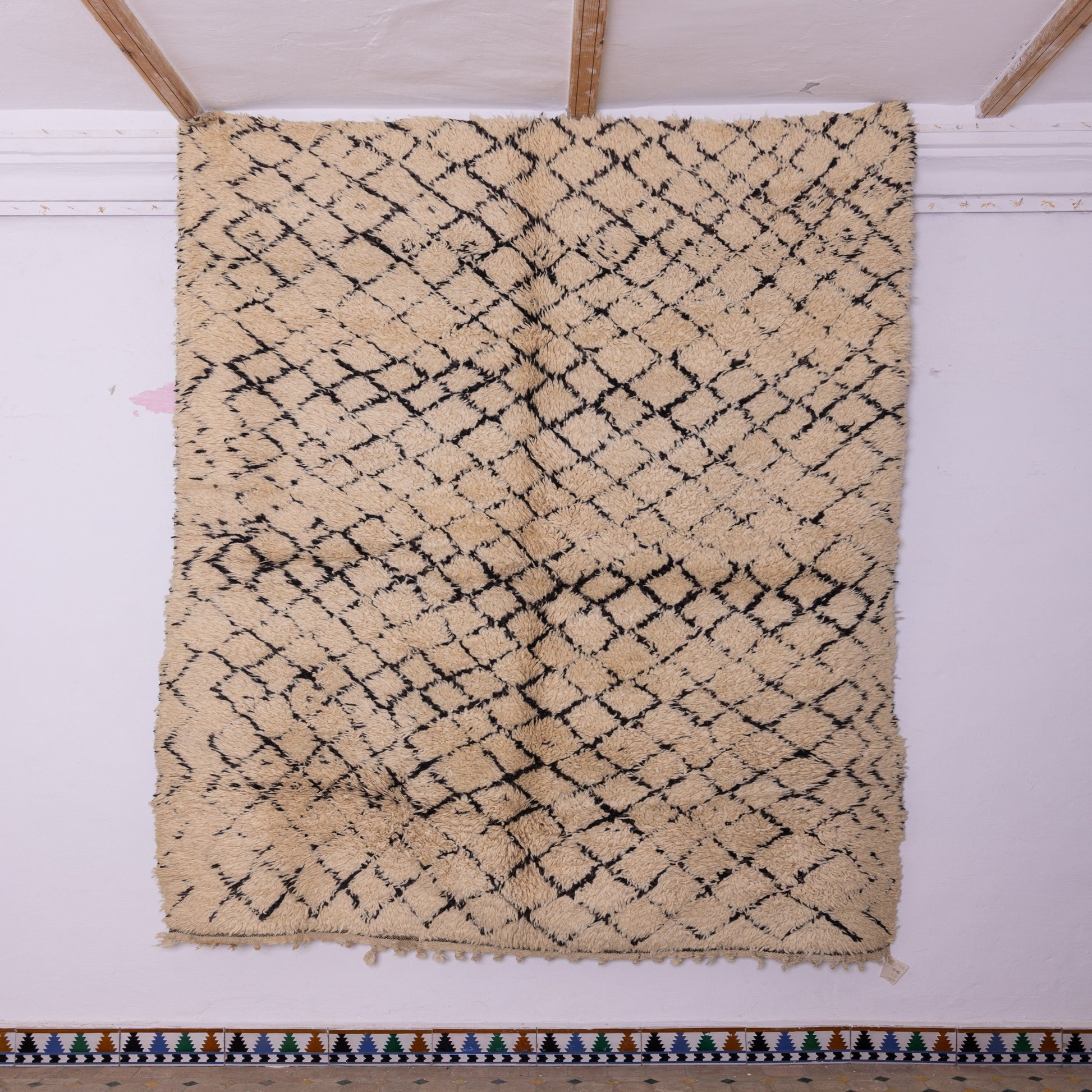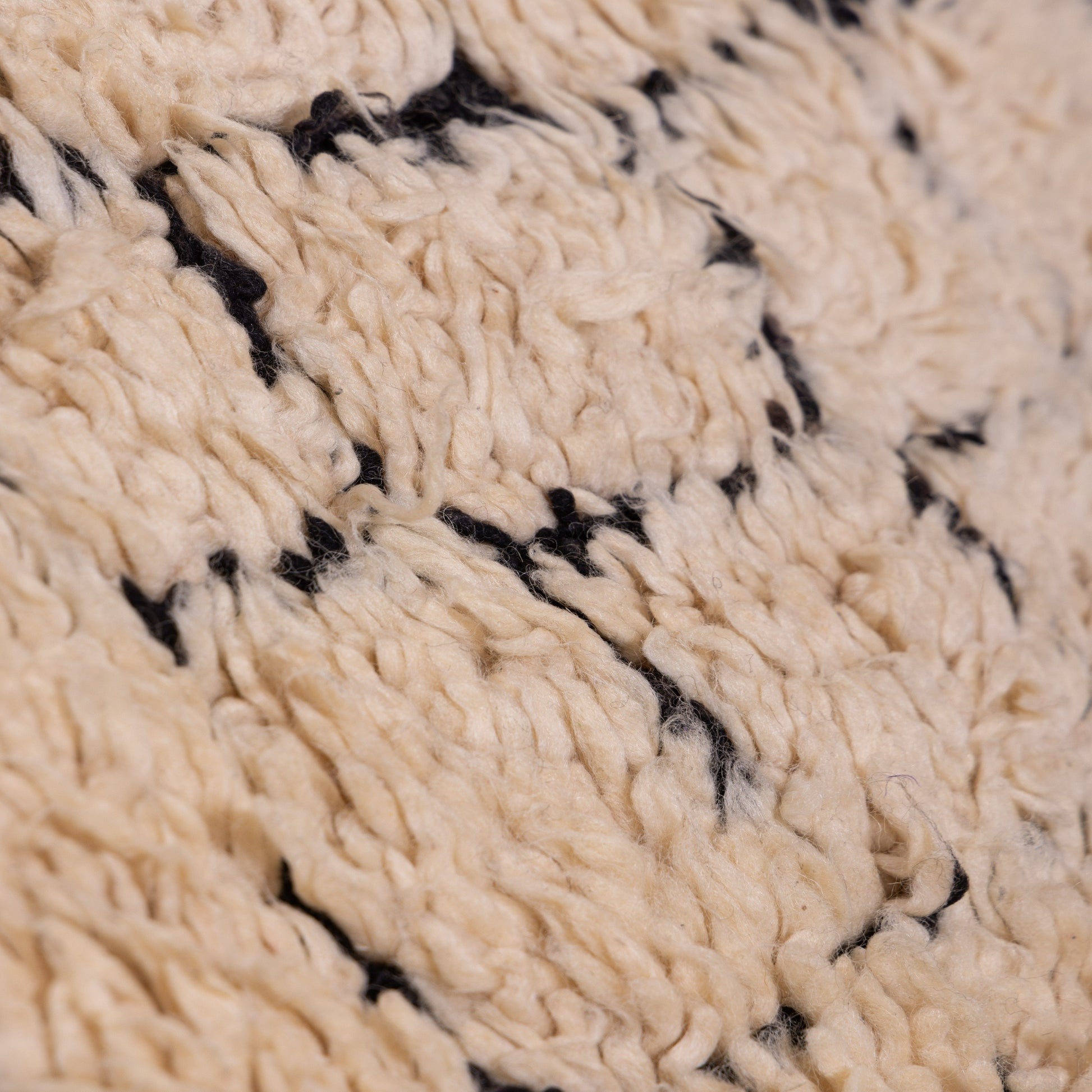 Transform your space with the unmatched elegance of this handwoven Moroccan Beni Ourain rug. Woven by skilled Berber artisans, this exquisite rug features a soft ivory wool base adorned with intricate black diamond motifs, a classic symbol of protection and prosperity in Berber culture.