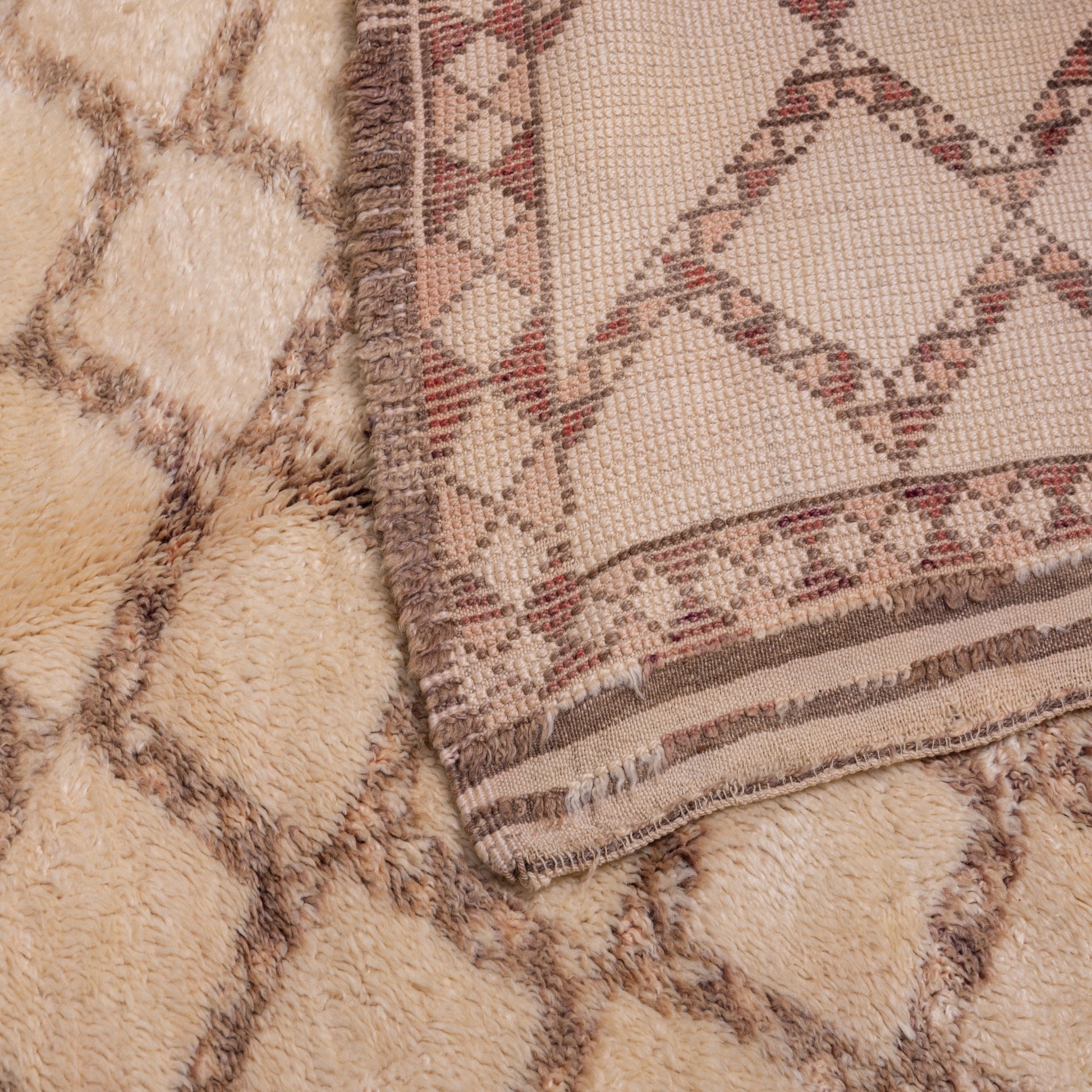 This rug showcases a classic diamond lattice pattern, intricately designed with earthy brown and subtle orange tones, giving it a unique tribal aesthetic. The geometric motifs symbolize protection, unity, and a deep cultural connection to nature, making this piece not just a rug, but a piece of history. The slightly irregular, organic pattern is a signature of authentic Berber rugs, adding to its charm and one-of-a-kind appeal.