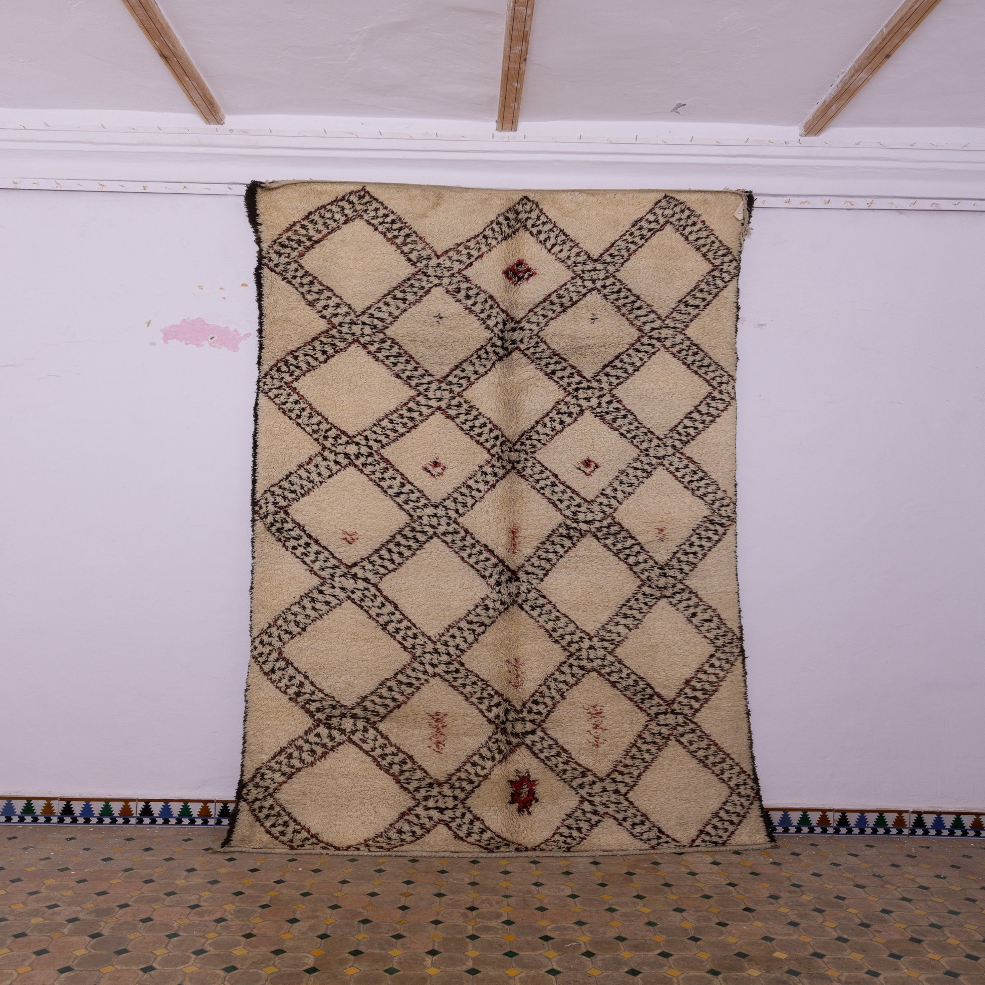 The rug features a classic diamond lattice pattern, a hallmark of Berber design, symbolizing protection and harmony. Each diamond is beautifully outlined with intricate black and terracotta tribal details, adding depth and cultural significance to the piece. Delicate red accents woven into the fabric tell a unique story, making this rug a work of art that carries the spirit of generations.