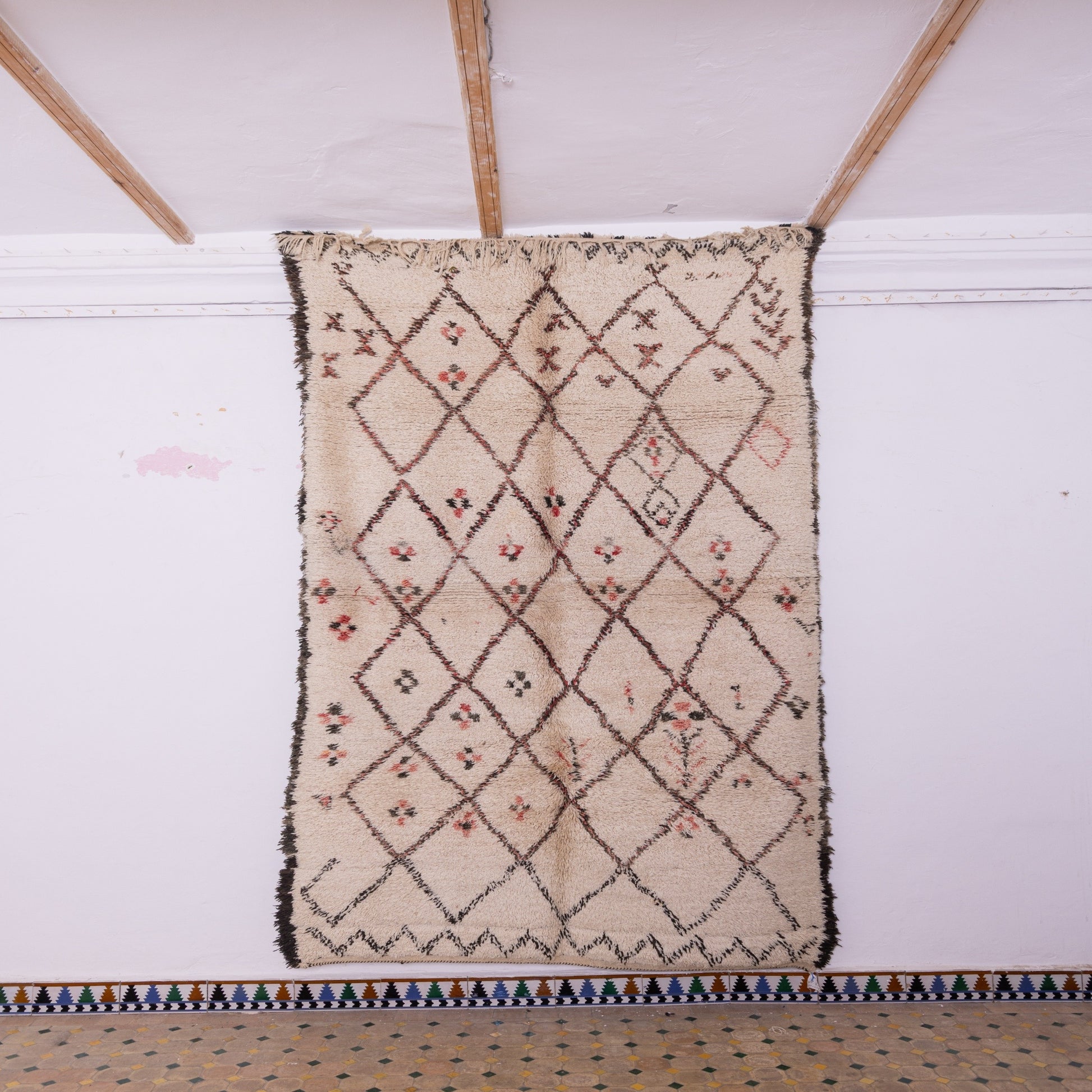 This authentic vintage Moroccan rug, handwoven by Berber artisans, blends traditional geometric diamond patterns with delicate floral accents in soft red and black hues. The intricate design represents protection and harmony, making it a unique statement piece.