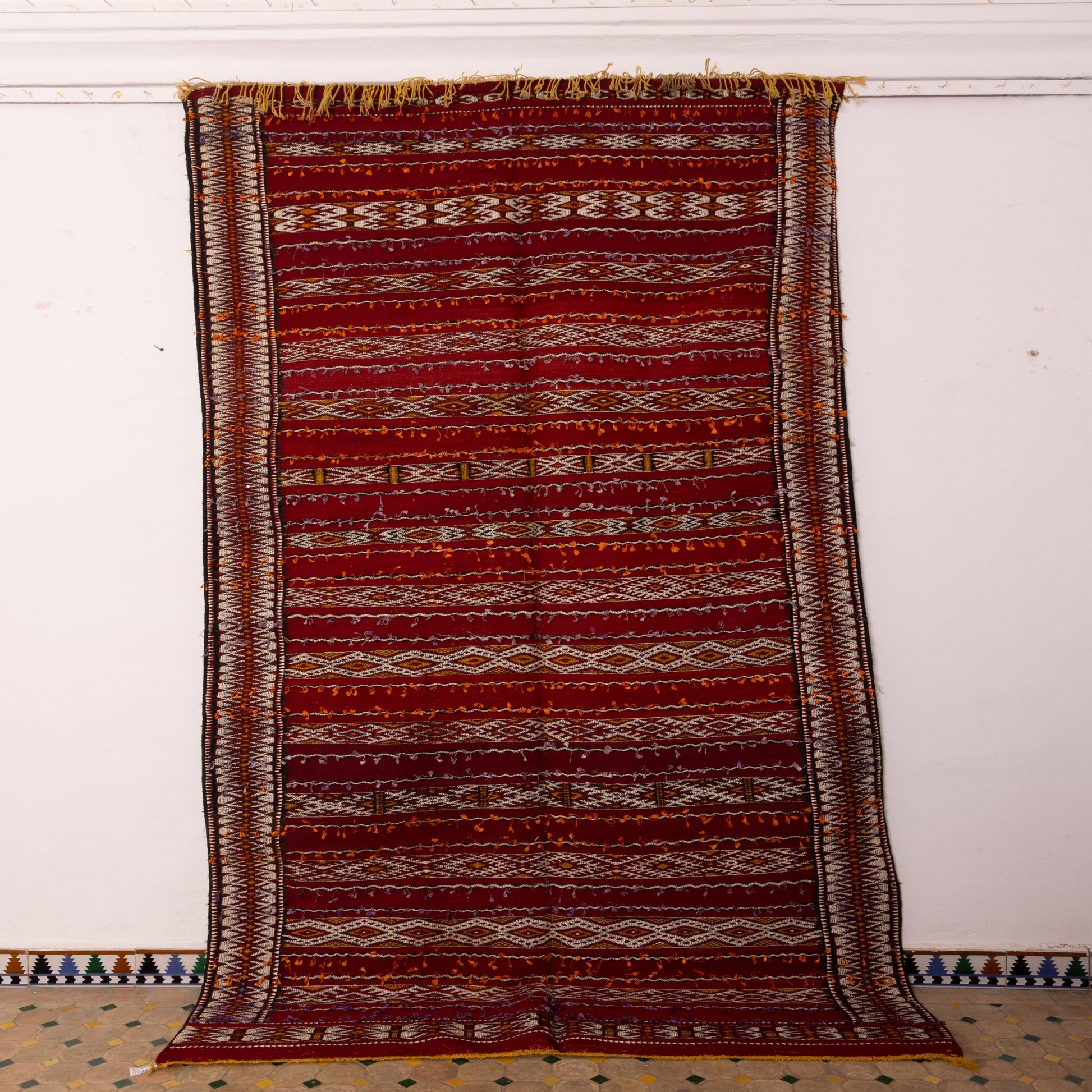 Add a touch of Moroccan heritage to your home with this handwoven vintage Berber Kilim rug! This stunning tribal carpet features a rich red base adorned with intricate geometric motifs, traditional Berber symbols, and delicate detailing.