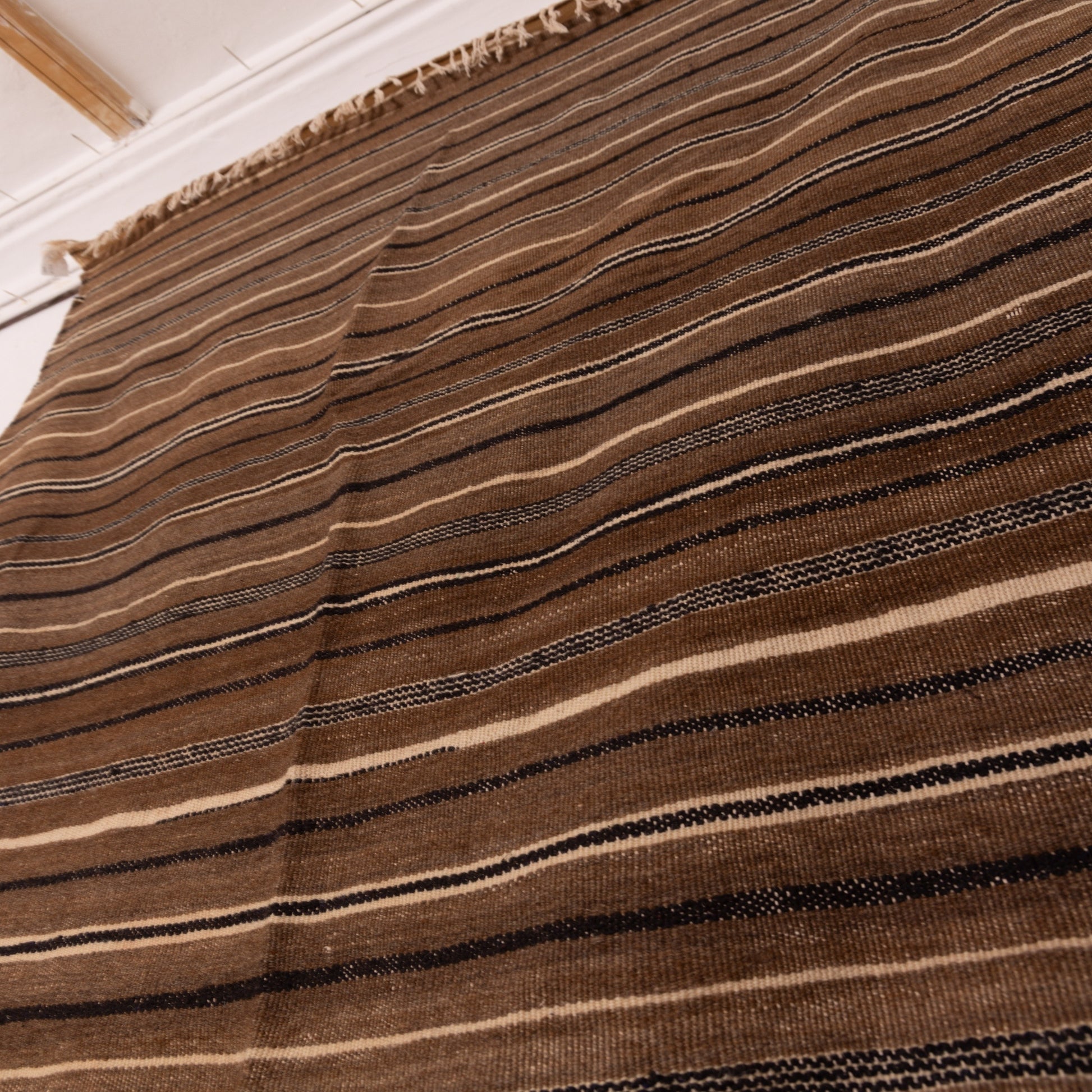 This authentic vintage Moroccan wool blanket is a stunning representation of Berber craftsmanship, handwoven using natural wool fibers. Featuring earthy brown and black stripes, this piece embodies the rustic charm of Moroccan nomadic textiles.