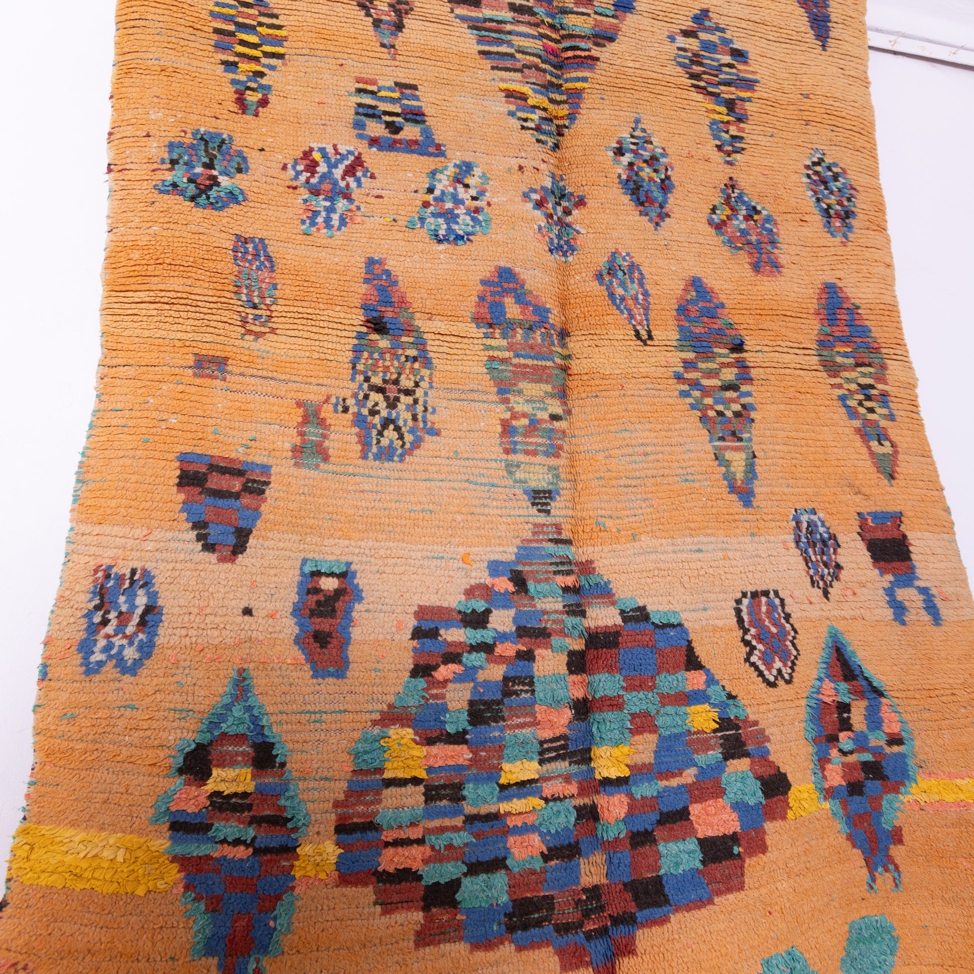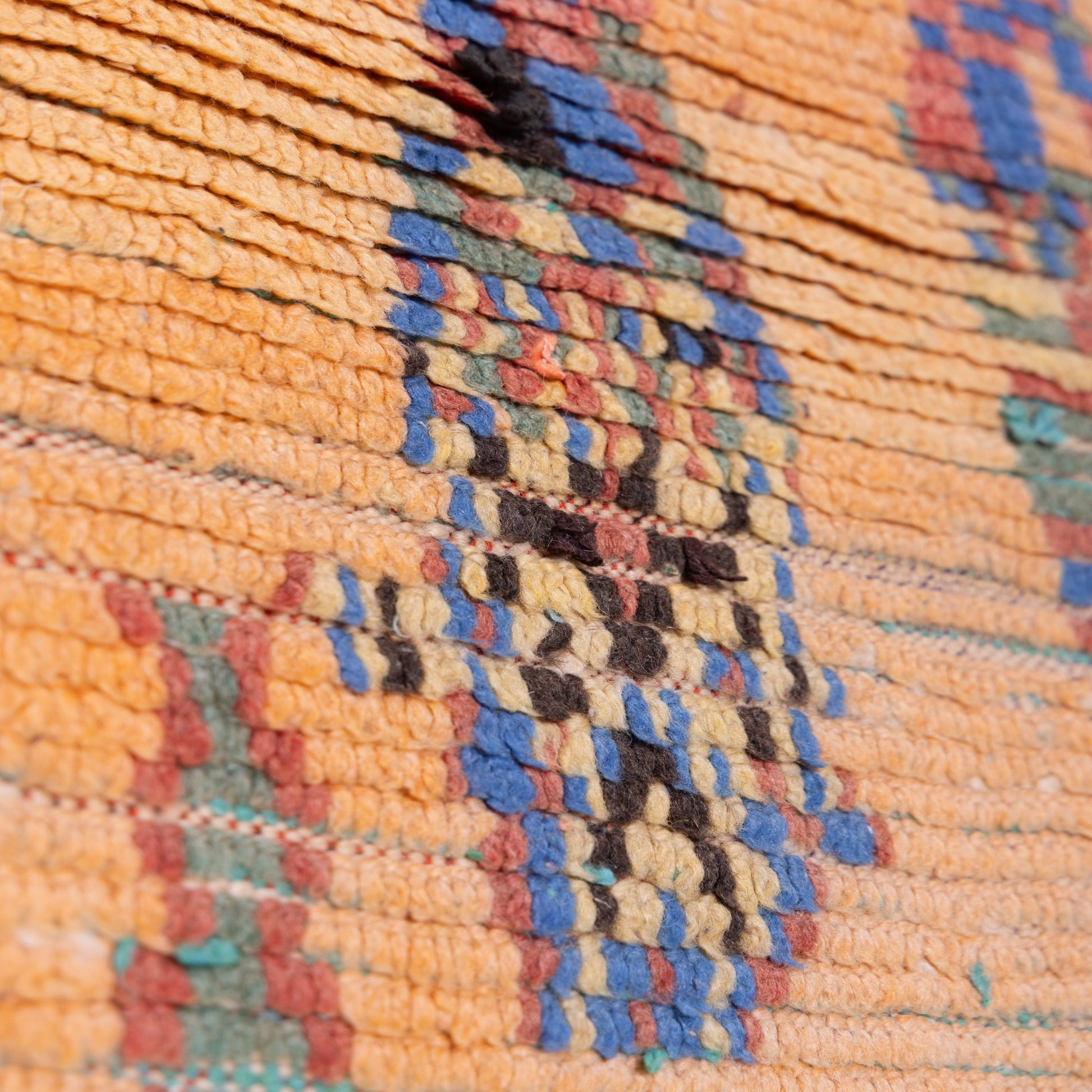 Discover the charm of Moroccan craftsmanship with this stunning vintage Rehamna rug, a truly unique piece featuring an abstract tribal pattern on a warm golden-orange base. The mesmerizing geometric motifs and tribal symbols are beautifully handwoven in vibrant shades of blue, red, green, and yellow, making this piece a striking statement rug. Handmade from 70% sheep wool and 30% goat wool, this rug is a one-of-a-kind treasure that blends artistry with tradition.