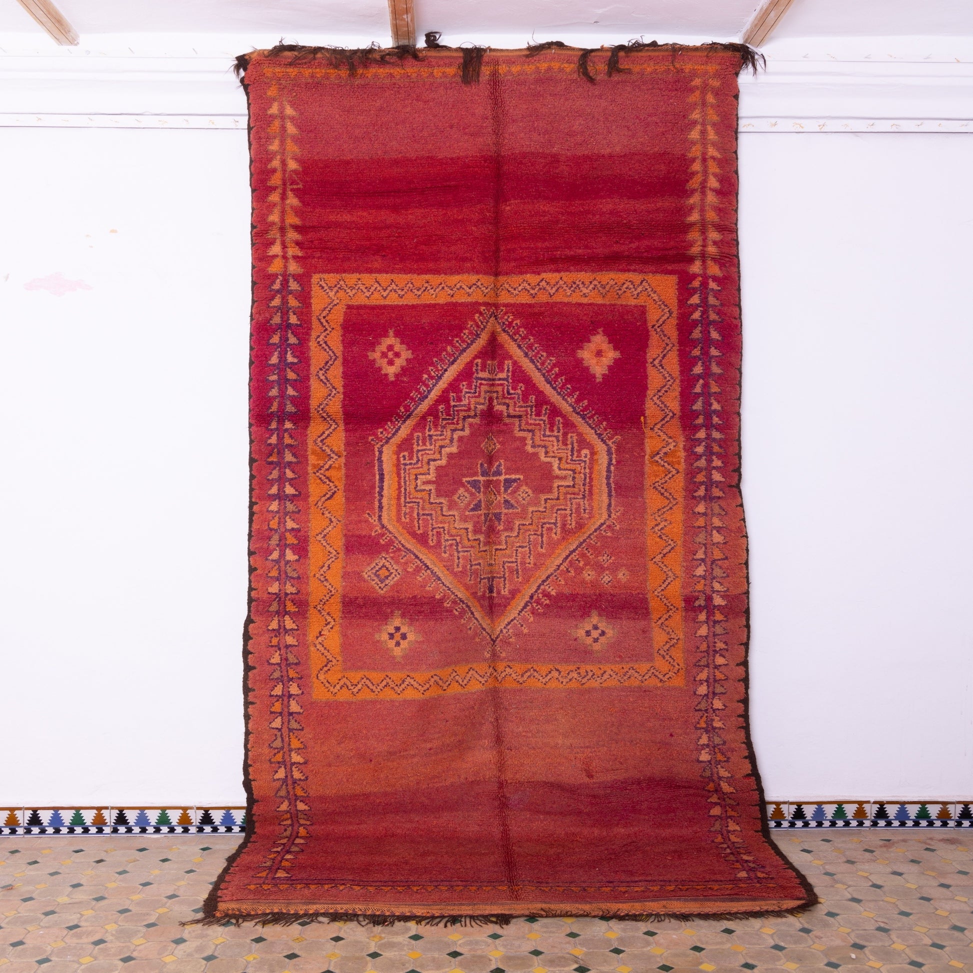 Add a bold touch of Moroccan heritage to your home with this stunning vintage Rehamna rug. Handwoven by Berber artisans, this rug features a striking central diamond medallion, framed by rich geometric patterns in warm red and burnt orange tones.
