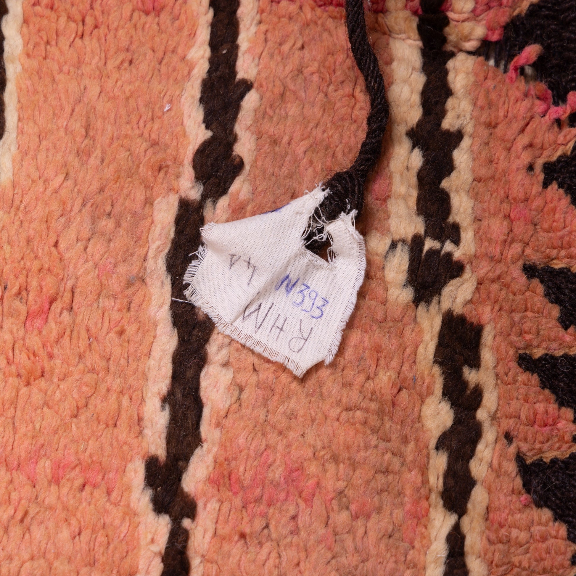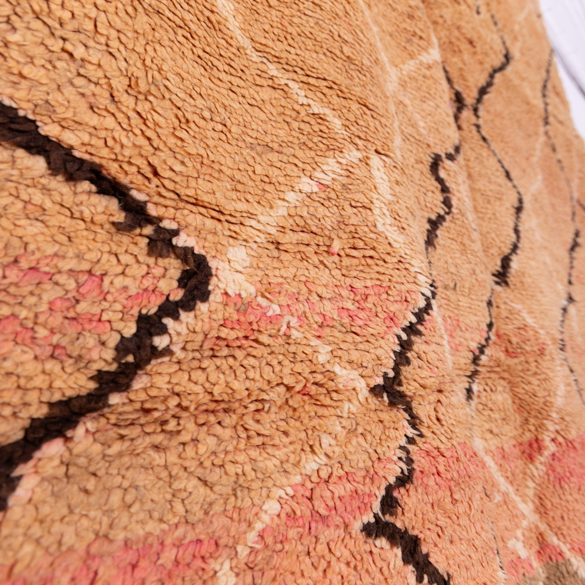 Bring the warmth of authentic Moroccan craftsmanship into your home with this stunning vintage Rehamna rug. Handmade by Berber artisans, this rug features an intricate abstract lozenge pattern in soft beige, earthy brown, and faded terracotta pink, accentuated by classic black tribal lines.