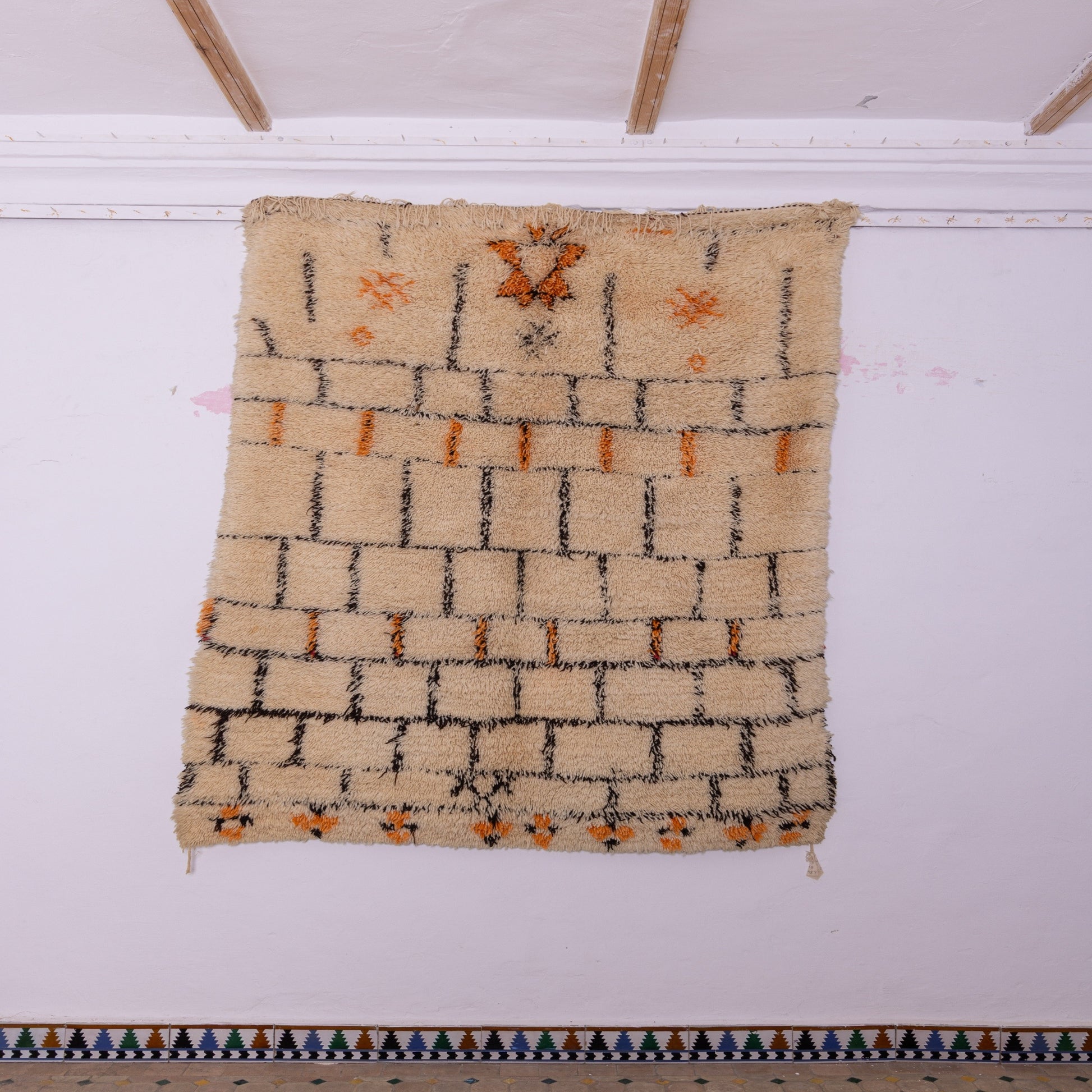 This rare and symbolic Moroccan wedding rug is a true work of art, handwoven by Berber women as a blessing for a new marriage. Traditionally crafted for brides, these rugs feature meaningful motifs representing love, prosperity, and protection. This piece is woven with 100% natural wool and adorned with intricate geometric patterns in warm ivory, black, and burnt orange hues—a perfect addition to bohemian, vintage, or eclectic decor.