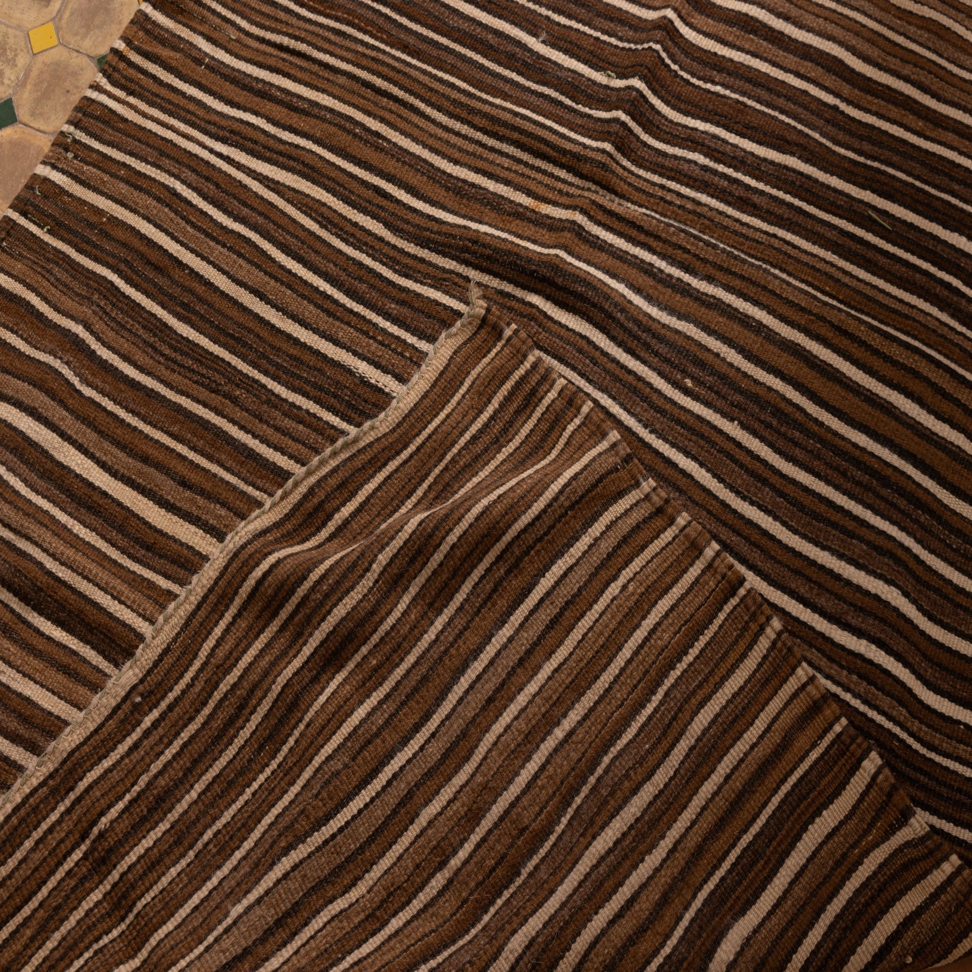 This handwoven Moroccan wool blanket is a timeless piece of Berber craftsmanship, featuring a classic striped pattern in rich, earthy brown and beige tones. Woven by artisans of the Atlas Mountains, this vintage textile is full of character and history, making it a unique addition to any home.