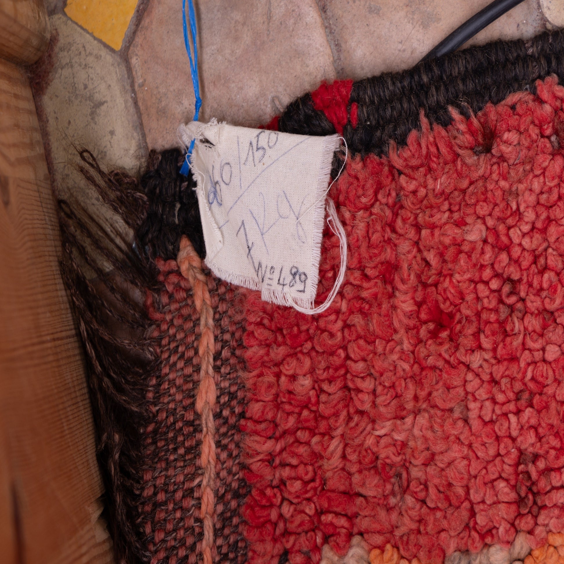 Bring warmth, culture, and history into your space with this stunning vintage Rehamna Moroccan rug, a true piece of Berber artistry. Handwoven in Morocco by skilled artisans, this one-of-a-kind rug features a bold red base with intricate geometric motifs in shades of orange, black, and beige. The symmetrical diamond patterns, framed by contrasting checkered borders, add a captivating tribal touch to any decor.
